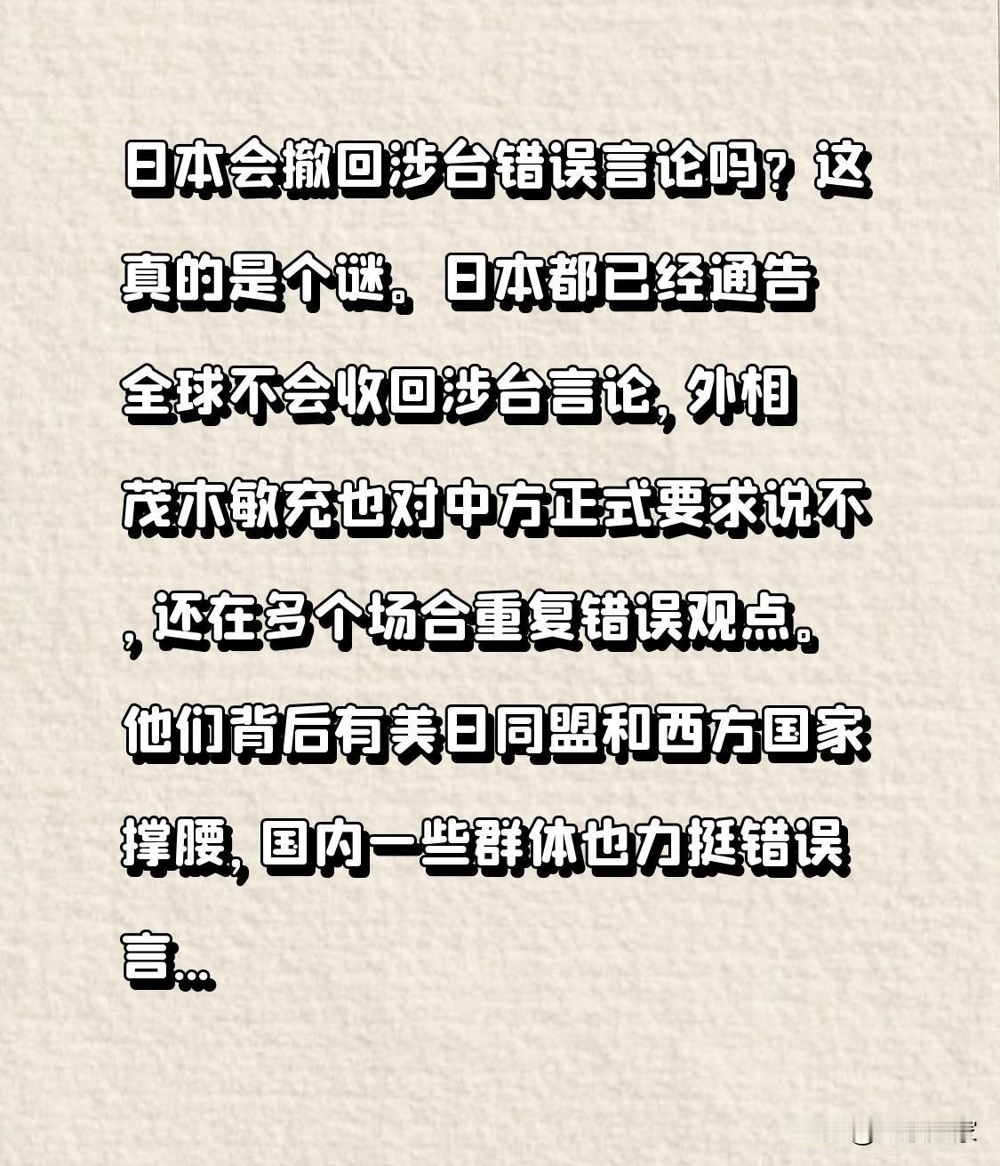 日本会撤回涉台错误言论吗?这真的是个谜。日本都已经通告全球不会收回涉台言论,外相茂木敏充也对中方正式要求说不,还在多个场合重复错误观点。他们背后有美日同盟和西方国家撑腰,国内一些群体也力挺错误言论。在外交圈,日本官员的态度强硬,舆论上还指责中方“反应过头”。 既然日方四次拒绝撤回,再纠结他们口头撤回没啥用,不如采取可量化的反制。比如在经贸、出行等方面让他们付出代价。咱也不能放松海上等方面的应对。至于日本会不会撤回,就看他们是继续执迷不悟,还是能幡然醒悟了。大家觉得日本最终会怎样呢?日本的挑衅还会有啥新花样?我们又该如何进一步反制? 日本战略改变 日本涉台战略 日本对华外交 日本涉台动向 日本海域军演 中方对日本态度 日本涉台战略 中方正告日本 日本对美态度 日本涉台动向 对台评论 日本辩论