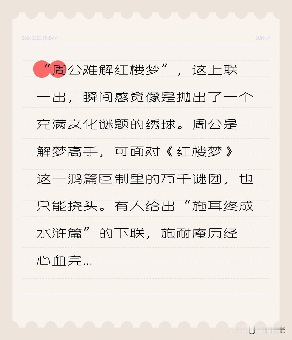 “周公难解红楼梦”,这上联一出,瞬间感觉像是抛出了一个充满文化谜题的绣球。周公是解梦高手,可面对《红楼梦》这一鸿篇巨制里的万千谜团,也只能挠头。 有人给出“施耳终成水浒篇”的下联,施耐庵历经心血完成《水浒传》,对仗工整又巧妙。不过对联的世界可是海阔天空,肯定还有更多精妙下联等着被发掘。 各位才高八斗的朋友,你们心中有没有合适的下联呢?快来一展身手,也可以分享下对对联的独特见解,或者说说那些让你印象深刻的对联故事。 上联天花板 神级下联 下联寻无双妙手 红楼梦未解之谜 正解红楼 下联状元 下联天才 红楼梦未解之谜 正解红楼 对红楼 神下联 诗篇解梦 解梦宝典 解梦