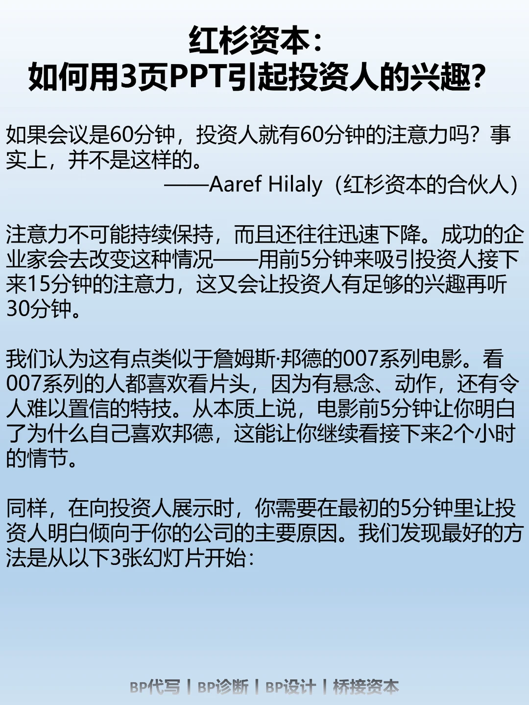 注意力不可能持续保持,而且还往往迅速下降。成功的企业家会去改变这种情况——用前5分钟来吸引投资人接下来15分钟的注意力,这又会让投资人有足够的兴趣再听30分钟。