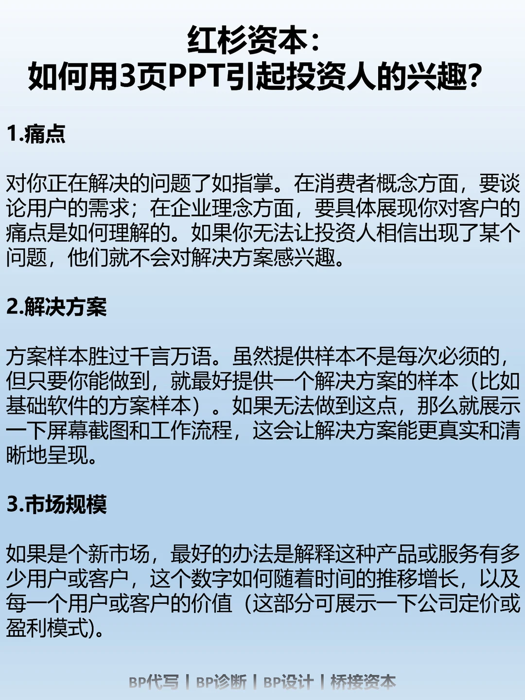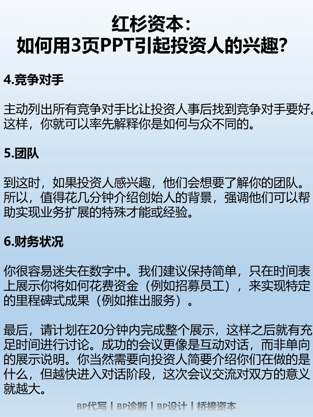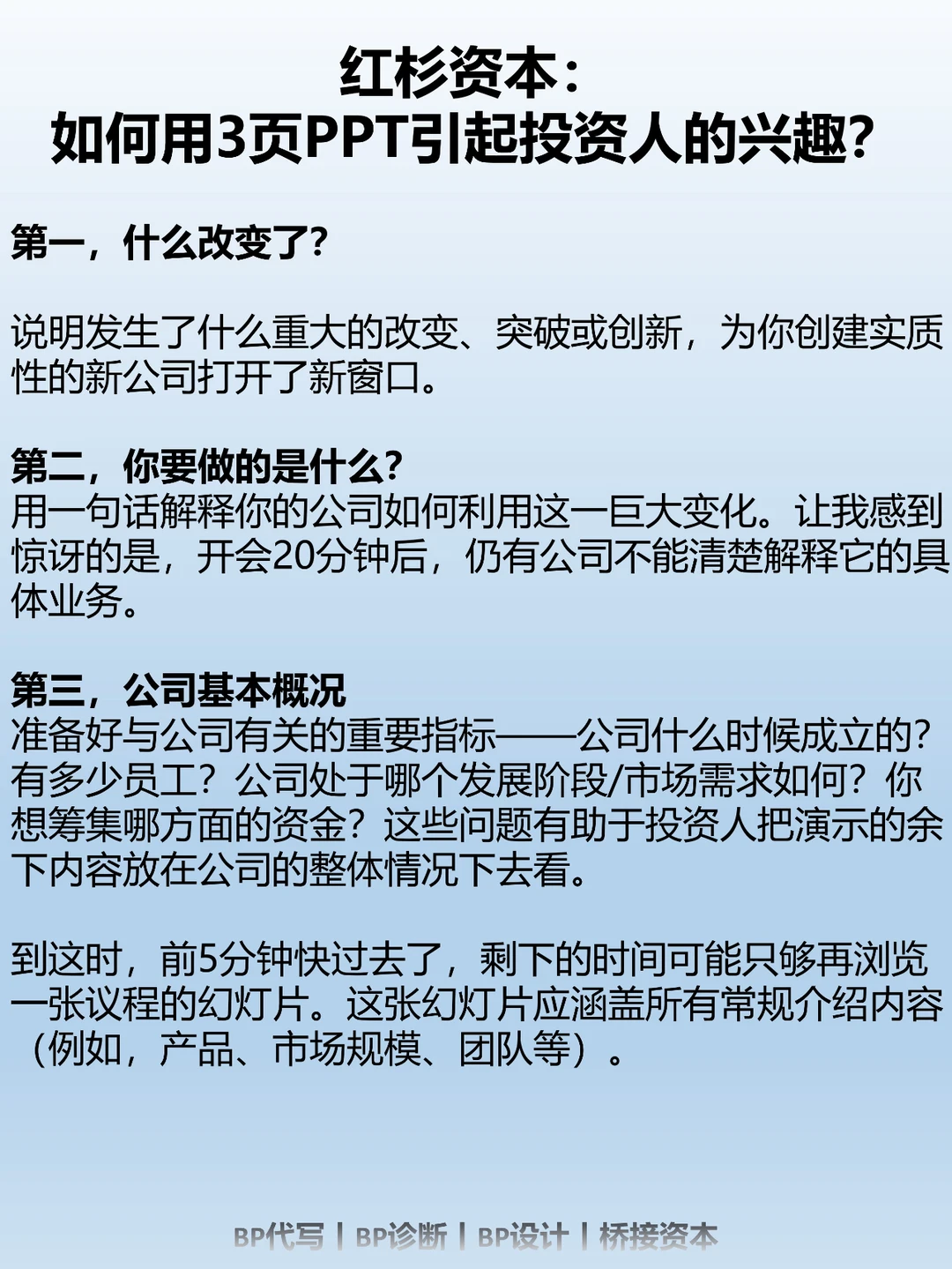 同样,在向投资人展示时,你需要在最初的5分钟里让投资人明白倾向于你的公司的主要原因。