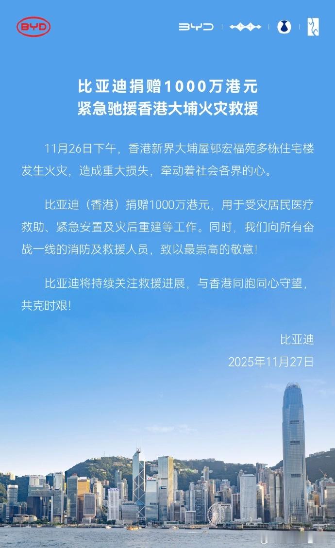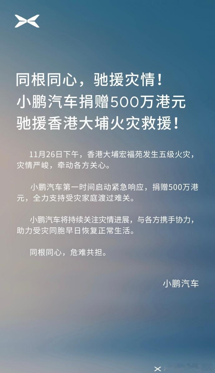 今日多家车企捐款驰援香港大埔火灾救援助力受灾同胞早日恢复正常生活同根同心,危难共担