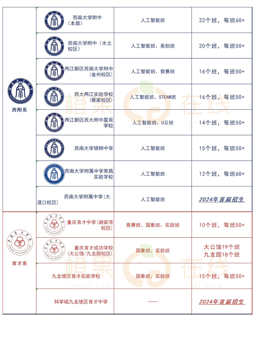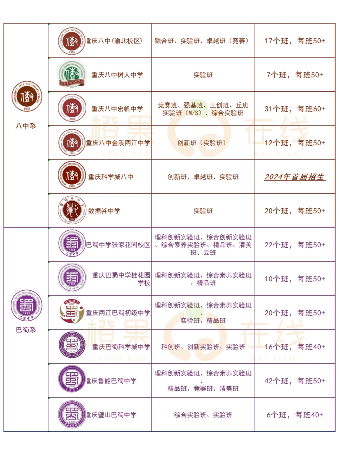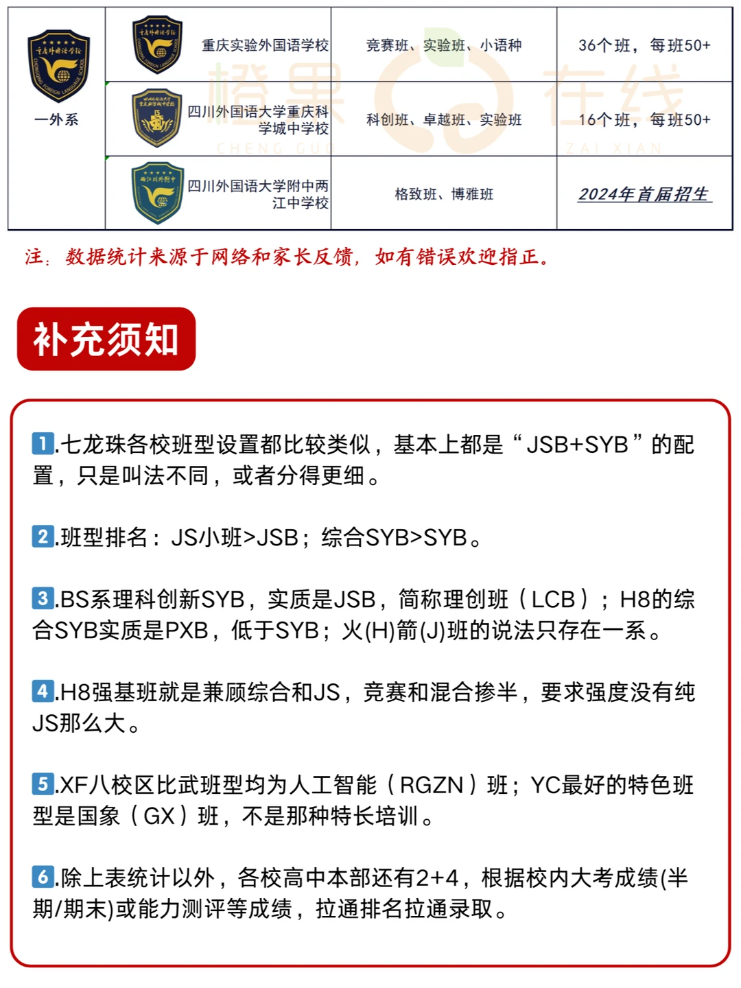 ✅重庆七龙珠是代表重庆市中学教育实力的一批学校,如今各校多元化培养模式(或者说是升学规划)已经趋于成熟,大致分为竞赛路线、中高考综合路线以及艺体特长路线,个别学校还有国际路线。 ⭐其中,班型的选择实质是家长对娃儿未来的规划和定位,但不同的班型,教学模式教学进度任课老师会所有差别,因此在备考的过程中,爸爸妈妈有必要把班型问题摸清楚。(如图表所列) 📌【补充须知】🔥 1️⃣.七龙珠各校班型设置都比较类似,基本上都是JSB+SYB的配置,只是叫法不同,或者分得更细。 2️⃣.班型排名:JS小班>JSB;综合SYB>SYB。 3️⃣.巴蜀系理科创新SYB,实质是JSB,简称理创班(LCB);H8的综合SYB实质是PXB,低于SYB;火(H)箭(J)班的说法只存在一系。 4️⃣.宏八强基班就是兼顾综合和JS,竞赛和混合掺半,要求强度没有纯JS那么大。 5️⃣.西附八校区比武班型均为人工智能(RGZN)班;YC最好的特色班型是国象(GX)班,不是那种特长培训。 6️⃣.除上表统计以外,各校高中本部还有2+4,根据校内大考成绩(半期/期末)或能力测评等成绩,拉通排名、拉通录取。