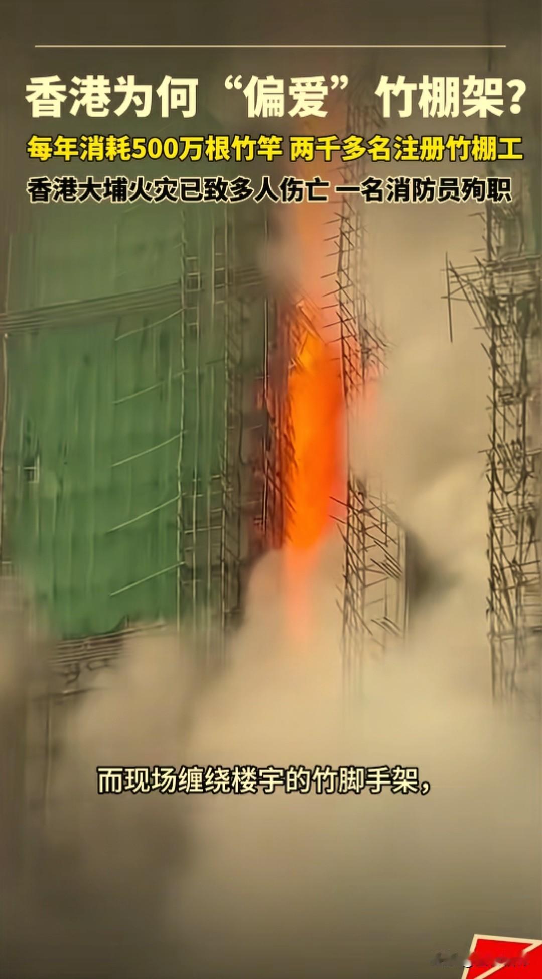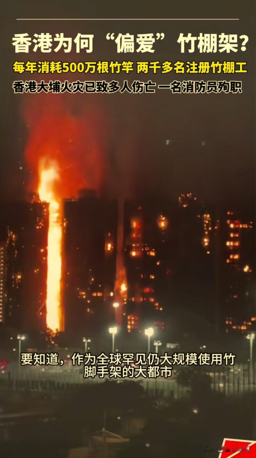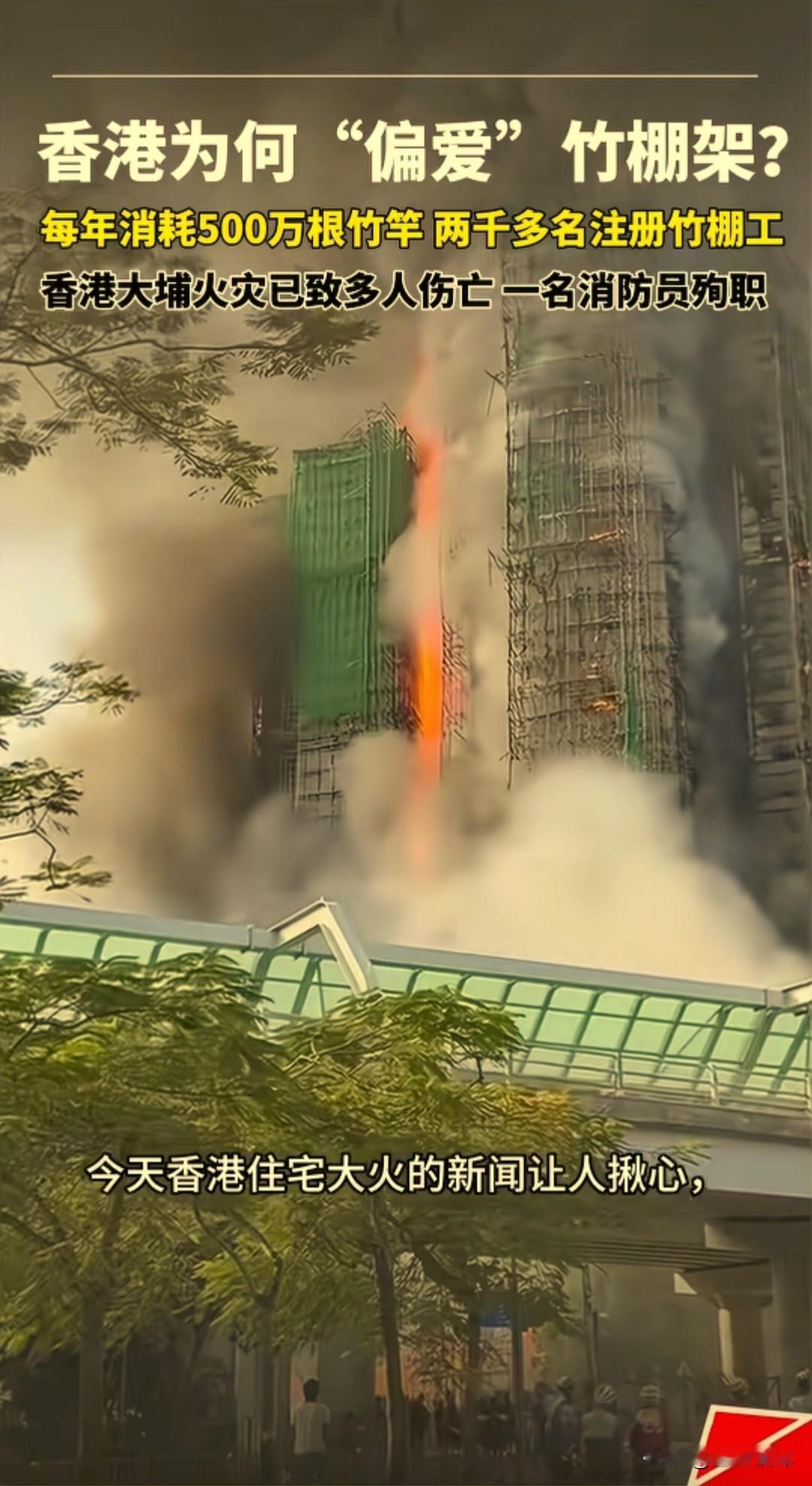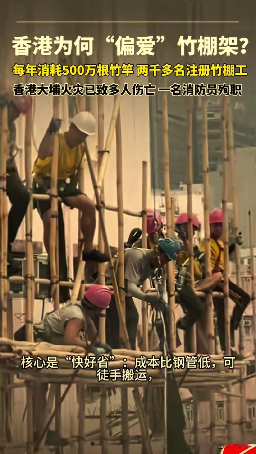 香港这次高层建筑火灾确实令人心痛,此次火灾也是香港数十年最严重的火灾事故之一,由于火势沿外墙竹棚架及围网等材料迅速蔓延,使得竹棚架的易燃性再次成为了大家关注的焦点。 香港的竹棚架是一种传统的建筑辅助结构,粤语称为“搭棚”,它在香港的楼宇建造、修缮以及节庆棚搭建中广泛应用。 搭棚技术在香港拥有悠久历史,相传由肇庆传至香港,并已形成一套成熟的工艺体系,工人们上手操作简单,无需图纸,仅凭经验就能够快速搭建和拆卸。 作为全球罕见仍大规模使用竹脚手架的大都市,香港每年要消耗超500万根竹竿,香港有专业的竹棚工人,目前注册的竹棚工有2500人左右,他们的日薪甚至能达到2200港元。 竹脚手架能大规模应用,主要它的成本远低于同等长度的铝合金或钢管,竹材重量轻,运输成本和搬运都更方便,直接降低了综合成本。 香港建筑密度高,街道往往比较狭窄,竹棚架的灵活性能更好的适应各种复杂的建筑,在局部维护和小型工程中更为方便。 但是近期火灾也引发了安全讨论,虽然竹棚架表面会涂有防火涂层,并具备一定的阻燃性能,但是竹棚架在耐燃方面始终不及金属棚架,金属棚架使用标准组件,能提供更公整的通道和平台,整体安全性更高。