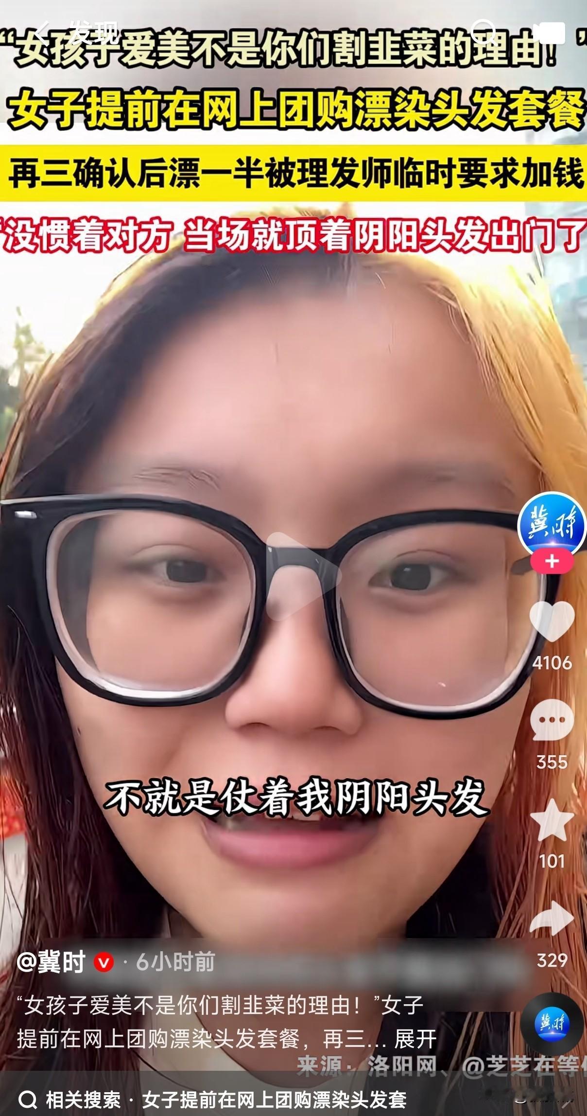 女子顶着阴阳头边走边吐槽理发店专割女孩子的韭菜,不按套路出牌,原因是她提前在网上团购飘染头发套餐,再三确认后漂一半被理发师临时要求加钱,给出的理由居然是她团购的那个药水用完了,只能加钱在染另一半。 女子顿时也火冒三丈,团购价38元的套餐染了一半,居然要688元,这明显是在割韭菜吗?店家可能认为女子已经染了一半,剩下的另一半她无论如何都会染的,因为这阴阳头就这样出门会被别人笑话的,可是女子偏偏就不信这个邪,她和店家理论完后就这样顶着阴阳头径直的走了,绝不给他们惯那毛病。 爱美是女孩子的天性,但不是所有的女孩子为了爱美都会被店家任由他们宰割,毕竟谁的钱都不是大风刮来的,如此出尔反尔的理发店能干长久吗?这是不是为了割韭菜才开的店?