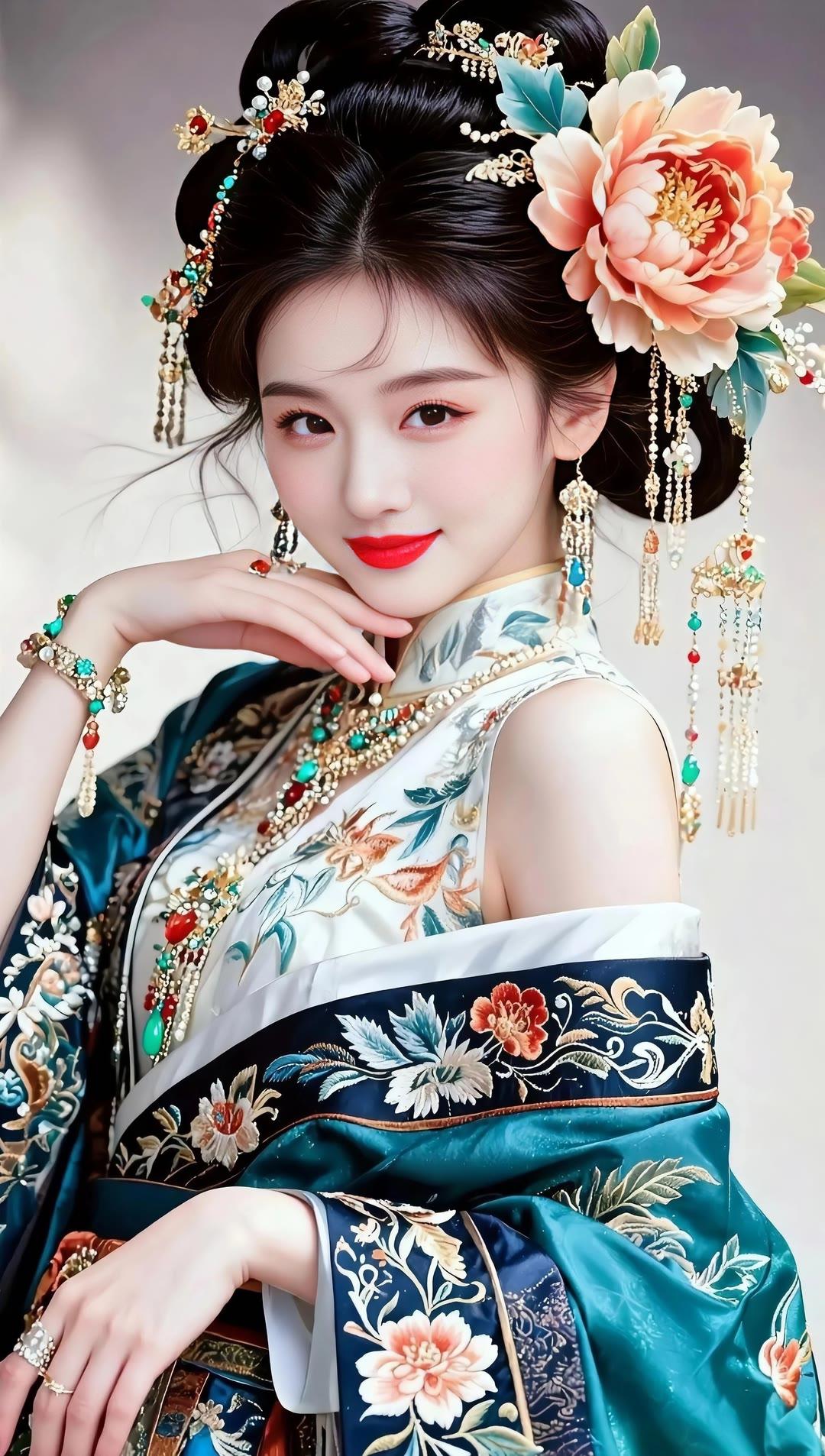古典美人,蓝白相间旗袍,花饰点缀,优雅动人。