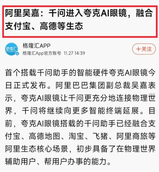 西方忽然发现,一夜之间中西方攻守易形了,中国站在了科技之巅! “中国只会低端制造,高端智造还得看西方”—— 这话要是放在十年前,或许没人敢硬杠,但现在再说这话,简直是闭着眼睛说瞎话。 这些年中国科技的爆发式增长早就打破了偏见,尤其是最近夸克 AI 眼镜的发布,更是把 “中西方攻守易形” 的信号拉得满满当当。 先给没关注新闻的人捋捋这事:11 月 27 号,夸克一下子甩出了两款 AI 眼镜 —— 带双显的旗舰款 S1 和主打轻便的 G1,加起来六个单品,价格从 1899 元到 3799 元不等。 当天就在天猫、京东开卖,全国 82 个城市的 600 多家门店还能现场配镜体验。但比产品本身更炸的是,这六款眼镜全都内置了阿里千问 AI 助手,等于给普通眼镜装了个 “超级大脑”。 别觉得 “眼镜加 AI” 是噱头,这波组合里藏着中国智造的真功夫。先看硬件硬不硬 —— 以前的智能眼镜不是笨重得像科幻道具,就是户外强光下啥也看不见,夸克 S1 直接把亮度拉到 4000 尼特,正午太阳底下看导航、查翻译都清清楚楚。 更绝的是拍摄能力,0.6 秒就能抓拍,夜里聚餐拍视频,靠那个行业首创的 Super Raw 暗光技术,不用补光灯也能拍清楚人脸,这可是把手机级的影像技术塞进了眼镜里。 最戳用户痛点的是解决了 “续航焦虑”。夸克搞了个双电池可换电设计,镜腿拔下来就能换电池,出差党再也不用天天揣着充电宝找插座了。 而且这眼镜做得是真轻薄,镜腿才 7.5 毫米宽,比行业主流产品窄了近三分之一,40 克的重量戴一天都不压鼻梁,完全不像以前那些 “极客玩具” 般笨重。 这些细节可不是靠组装能搞定的,得是对用户需求摸得透透的,再用顶尖工艺实现,这正是高端智造的精髓。 再说说千问 AI 助手的 “软实力”。这可不是随便装个聊天机器人,而是真能帮你办事的 “第二大脑”。你在地铁里吵吵嚷嚷地问它 “附近哪家粤菜馆评分高”,五个麦克风阵列加骨传导技术能精准拾音,噪音再大也能听懂。 更关键的是它打通了阿里的生态,戴眼镜扫一下就能用支付宝付钱,出差时自动弹出飞猪的航班提醒,逛商场看到喜欢的衣服,拍一下就链接到淘宝比价。 这种 “硬件 + AI + 生态” 的深度融合,西方同类产品根本做不到 —— 谷歌眼镜当年就栽在功能单一上,微软 Hololens 至今还没解决民用场景落地的问题。 市场的反应最能说明问题。其实早在双 11 预售时,夸克 S1 就悄悄登顶了 XR 设备热卖榜,3000 多的高端价位照样被抢着订。 要知道以前智能眼镜都是小众极客才会买,现在能走进大众市场,恰恰说明中国产品抓住了真实需求。 反观 HTC 刚出的 VIVE Eagle,价格差不多但续航才 3 个多小时,连基本的日常使用都满足不了,高下立判。 阿里巴巴副总裁吴嘉说的一句话特实在:“AI 助手的核心是办事能力,不是聊天机器人”。千问模型现在全球下载量都突破 7 亿次了,性能比 Llama 这些西方模型还强,把它装进眼镜里,等于给用户配了个随身的 “超级助理”。 这和当年西方卡我们脖子的芯片、系统不一样,现在是中国企业定义新产品形态,连技术标准都在我们手里。 以前总有人说中国 “抄作业”,但夸克这波操作根本没作业可抄:双光机显示、可换电电池、生态协同这些都是行业首创。这背后是阿里三年磨一剑的大模型技术,是硬件研发团队对人体工学的上千次调试,更是中国制造业从 “造得好” 到 “造得巧” 的蜕变。 说到底,夸克 AI 眼镜和千问的组合,就是中国高端智造的缩影 —— 不是跟在西方后面追,而是直接换道领跑。 当西方还在纠结硬件参数时,我们已经把 AI 能力融入生活场景;当他们的产品还停留在实验室时,我们的设备已经铺满 82 个城市的线下门店。这哪里是 “赶上西方”,分明是已经站在了新的科技之巅。