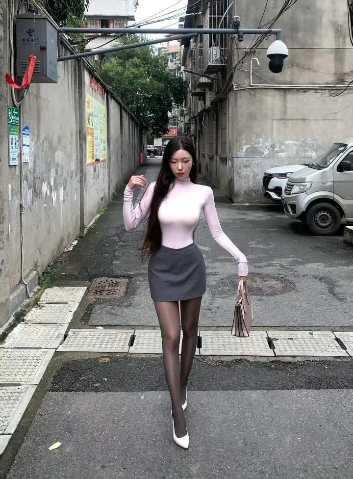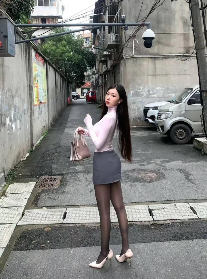 粉色高领衫搭配灰色短裙 黑丝袜[比心]