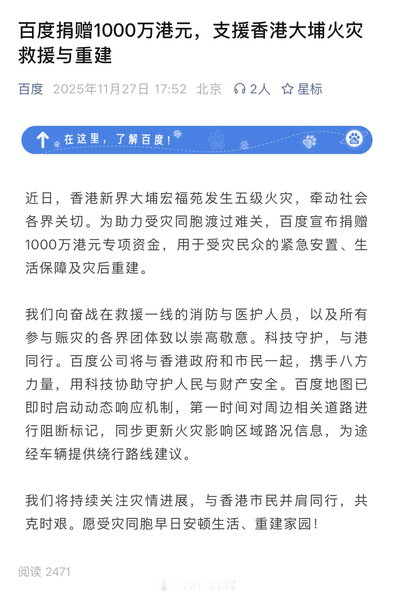 百度捐赠 1000 万港元支援香港大埔火灾救援与重建。308_IO