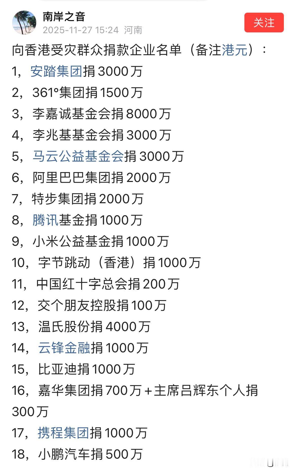 向香港火灾中受灾群众捐款的名单还在不断增加中……善款目前已经超过3亿了。 患难见真情。只要我们心往一处想,劲儿往一块儿使,拧成一股绳,困难一定会过去的。