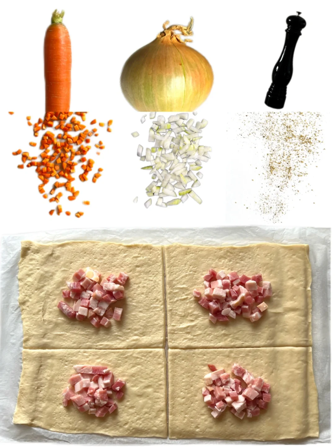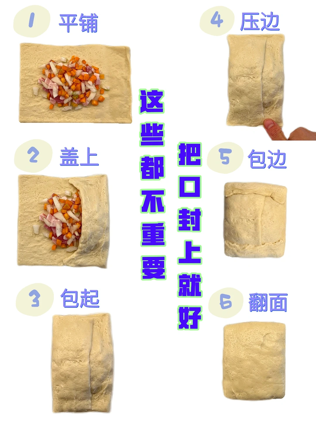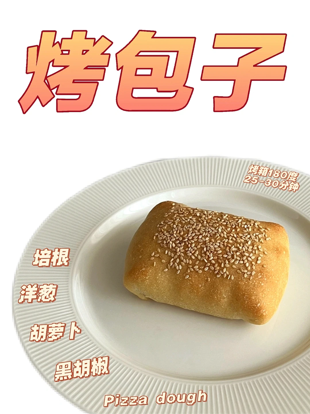 披萨皮室温放半小时再烤 材料比例随意 盐根据口味加 我培根放得多就没加 感觉合适 芝麻加不加都🉑️ 想颜色金黄还🉑️表面刷蛋液 包的过程无所谓 只要能封上口不漏就好
