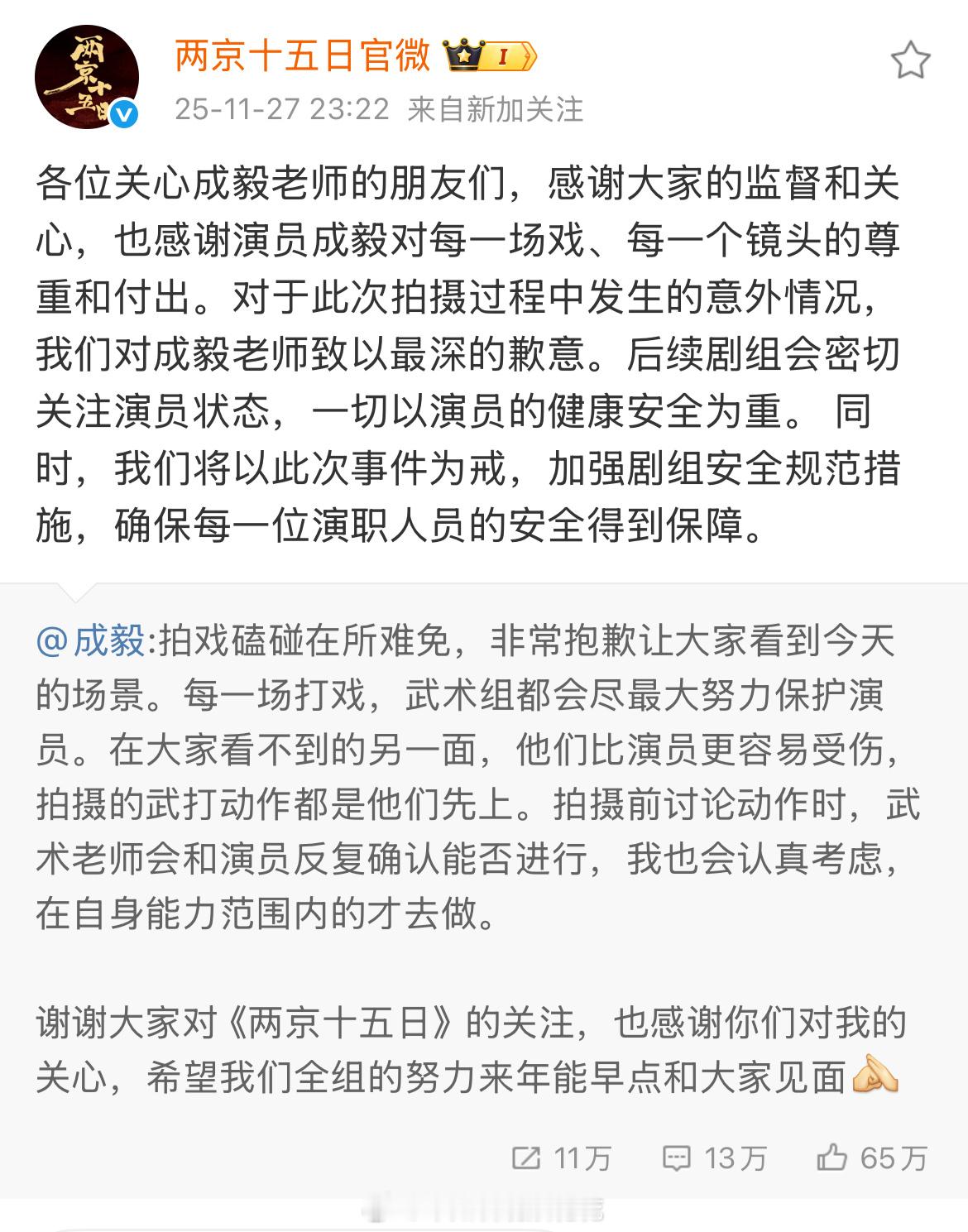 剧组发文向成毅道歉并表明后续会以演员安全为主两京十五日剧组发文回应成毅受伤两京十五日剧组对成毅道歉