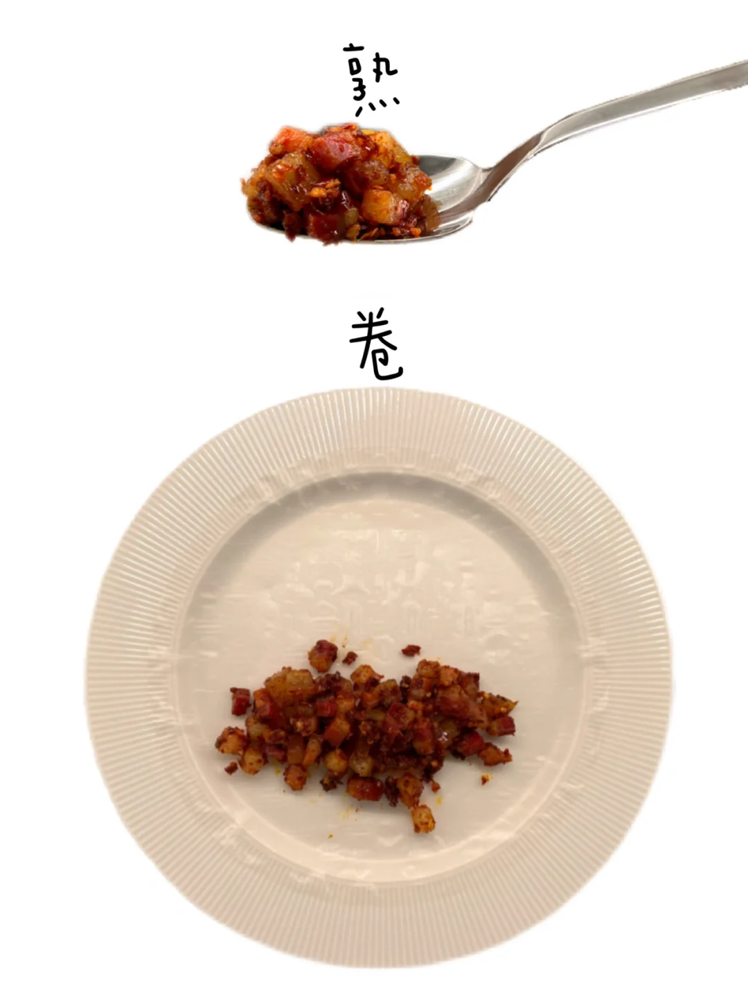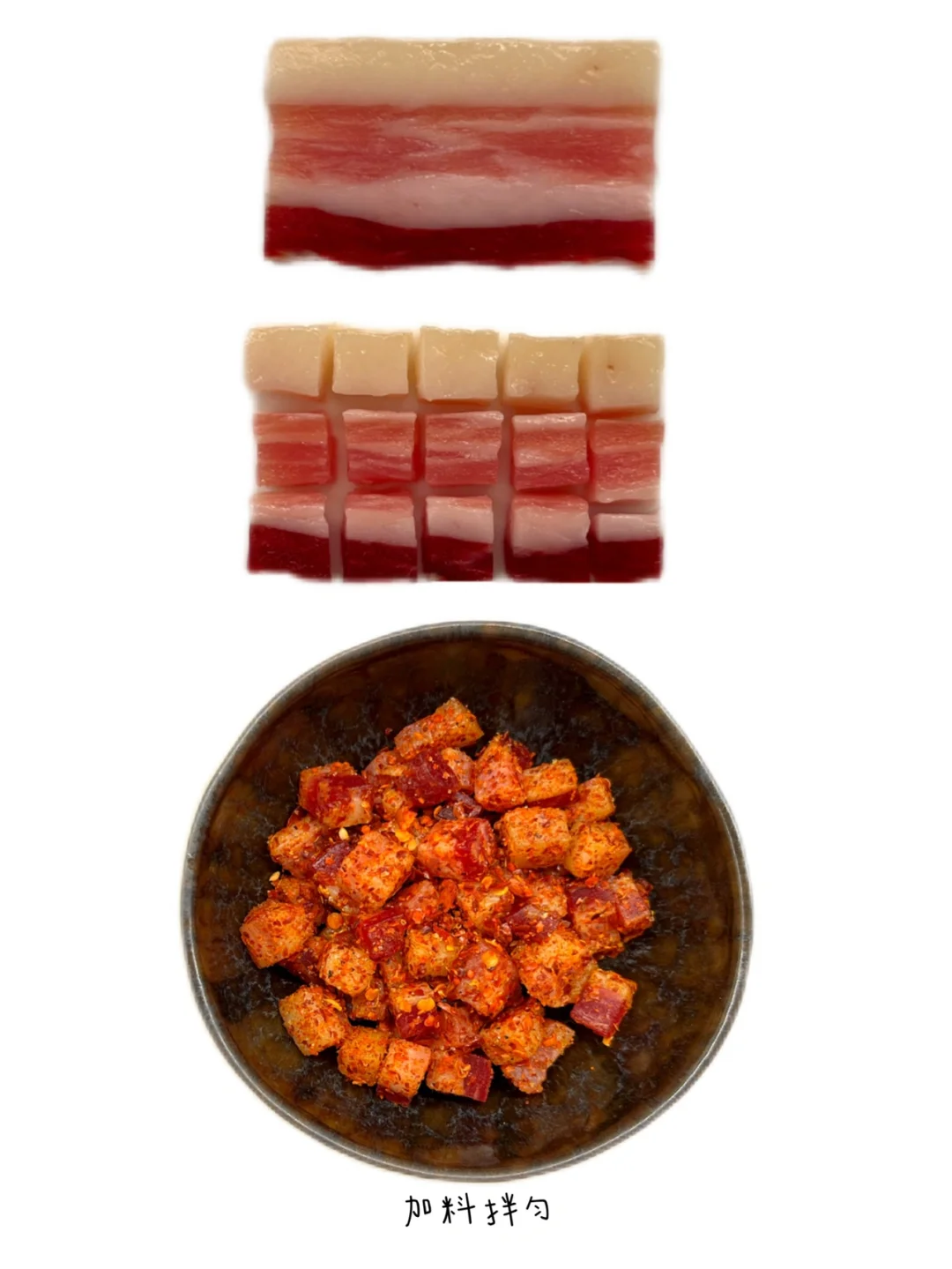 经一位川渝人民认证 味道🉑️! 培根肉切成1立方厘米左右大小 不要切的太均匀 最好有大有小 调料我弄的比例大约为 辣椒碎:花椒面:糖 = 5:2:1 能吃辣就多放辣 有麻椒最好用麻椒 不要用花椒 调料比例根据口味调整 肉和调料拌匀后隔水蒸熟 越南米纸粘水变软后 直接把蒸熟的肉粒放上去 卷起来两头封口就好了 当然最理智的还是直接切片拌调料 蒸熟了直接吃🤣 还有种重庆吃法也很🉑️ 原味蒸熟撒白糖 试试?