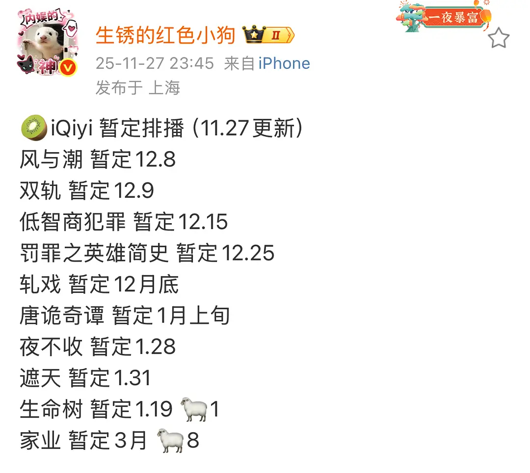 任嘉伦风与潮还没预热,已经🥝热搜总榜第三,电视剧榜第二,前面都是在播剧!伟大!