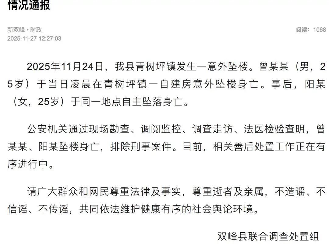 官方通报新郎新娘结婚前一天先后坠亡:男子意外坠亡,女子自主坠亡 11月27日,湖南双峰县联合调查处置组通报:11月24日,我县青树坪镇发生一意外坠楼。曾某某(男,25岁)于当日凌晨在青树坪镇一自建房意外坠楼身亡。 看到这条通报,我心里一沉。第二天原本是他们的好日子,结果把喜事走成了噩耗。很多人第一时间去找八卦,猜是不是纠纷、是不是冲突。我反倒更在意没写进通报的那些细节:那一夜之前,他们经历了怎样的压力?谁在和他们说话?有没有人看出情绪已经失控? 官方排除刑案,说明没有他人施害。但生活里还有很多东西会把人压到喘不过气。筹婚这件事,很多人以为是甜蜜,真正经历过的都知道难。彩礼、婚宴、礼数、亲戚的期待、微信里的人情账,一条条列出来就像待办清单,但每一条都要真金白银和精力去填。夜深人静的时候,焦虑像潮水往上涌。睡不着,越想越乱。 我见过不少年轻人,为了体面硬扛预算,为了父母的脸面装作没事,为了“都定好了不能改”死撑到底。等到情绪崩掉,只要一个失足,一次冲动,可能就再也没有回头路。通报里只有几句话,留白很大。真相或许只有两位当事人知道,但我们能从这次里学到点什么,总不能什么都不改。 别再转发所谓“聊天记录”和“内幕”。未证实的东西,每转一次都是对家属的二次伤害。也别把故事往最戏剧的方向编。两条年轻的生命没了,网络上的好奇心不该踩在别人痛处上。 如果你正处在婚礼倒计时,给自己降噪:把待办砍到最重要的三件,没能力承受的直接说不。和伴侣坐下来,把钱和边界说清楚,能简办就简办。请一个能扛事的亲友当缓冲,不要把所有电话都接在自己身上。熬夜是情绪的大敌,睡不好,判断就会走样。 如果你是父母,放下面子,先保孩子的日子。能量入不敷出,体面就变成负担。别再用“亲戚都看着”去绑住孩子。孩子的安全和健康,比场面重要太多。 如果你是旁观者,不要把“都是命”当答案。把这当一次提醒:每个人身边都可能有那个在深夜不知所措的人。看见情绪的异样,别嫌麻烦,陪他去透透气,劝他先睡一觉,必要时求助专业力量。很多时候,一次拉一把,就能改写结局。 愿善后不只是程序和补偿,也包括对亲属的心理支持。愿我们以后谈到婚礼,谈的是彼此的笑和宽松的节奏,而不是谁被压垮了。今晚,给自己和身边的人发:有事一起扛,所有安排都能改,先把人放第一。 你经历过筹婚的崩溃时刻吗?你当时怎么转过弯的?