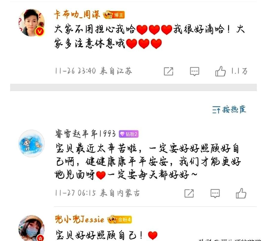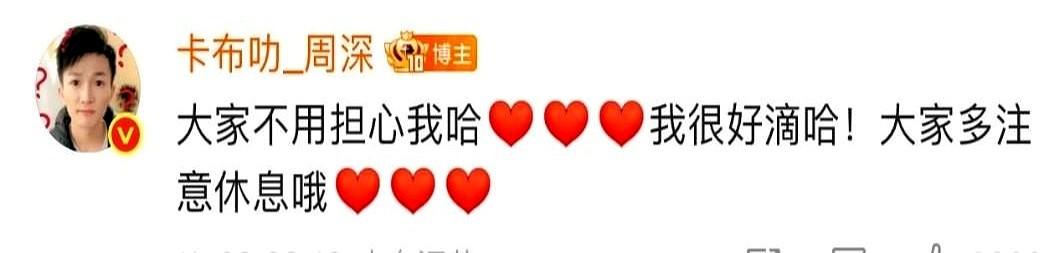 深夜十一点多,周深竟然干了这事。 原来是录节目的时候,深深嗓子不舒服,有感冒症状,据现场粉丝说是呼吸道水肿。这消息一出来,粉丝圈直接就炸了,大家伙儿都担心得不行。 结果当晚23:40,他本人,他本人亲自跑到一个旧博文的评论区留言,就为了报个平安。他说“我很好滴哈”,还反过来叮嘱粉丝注意休息。这种不占用公共资源,又精准安抚到核心粉丝群的操作,真的体现了他对粉丝的在意。 周深一直都很忙,又是《奔跑吧》常驻,又是发新歌《花开忘忧》,还登上了春晚舞台。就这么忙,还能第一时间察觉到粉丝的情绪并给出回应,这双向的奔赴感太真实了。 暖心归暖心,还是希望他能好好照顾自己,身体才是最重要的本钱。