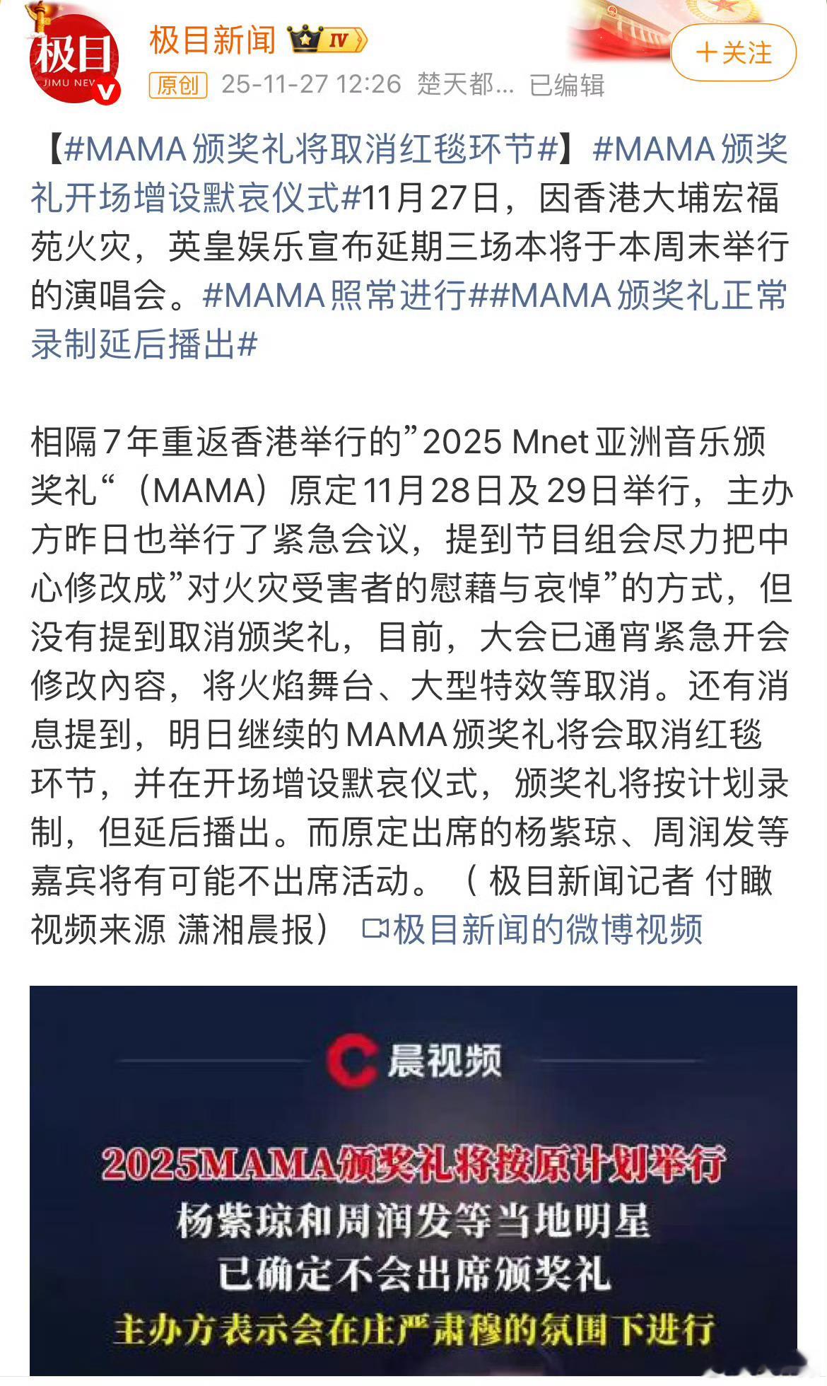 MAMA取消红毯 MAMA颁奖礼取消红毯环节,并在开场前增加默哀仪式。