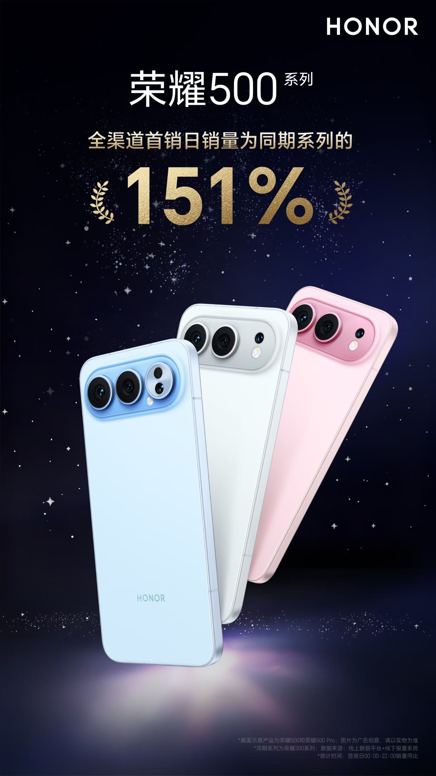 荣耀500系列首销又卖爆了,同期系列的151%……上代荣耀400系列本身就卖的很好,这代继续猛增。肖战代言有一方面原因,另外一方面原因还是产品力足够强,设计的也挺好看。