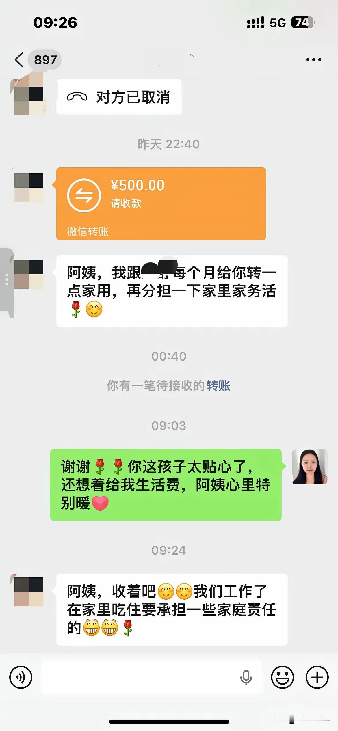 今早六点多我打开微信,突然看到23岁的儿子和他女朋友,各给我转了500块钱。 儿子特意留言说:“妈,这是给你的生活费,等我以后工资高了,再多给你转点。” 其实10月份他还在上班的时候,我跟他提过让他出点生活费,当时他就给我转了1000块。现在他正在找新工作,手头本来就不宽裕,还特意和女朋友商量着,一人给我转500。 更让我心里暖和的是,他女朋友还特意留了言,说以后有空会帮我分担点家务,这孩子也太贴心了。 我跟他们说:“你们这俩孩子也太懂事了,还惦记着给我生活费,阿姨心里特别暖!” 儿子给的这500块,我肯定得收。但他女朋友这500,我有点拿不定主意——不收吧,怕她觉得我见外,不把她当自家人;收了吧,又怕她多花钱,毕竟她也还在打拼。大家说我到底该怎么办才好?儿子给母亲转账