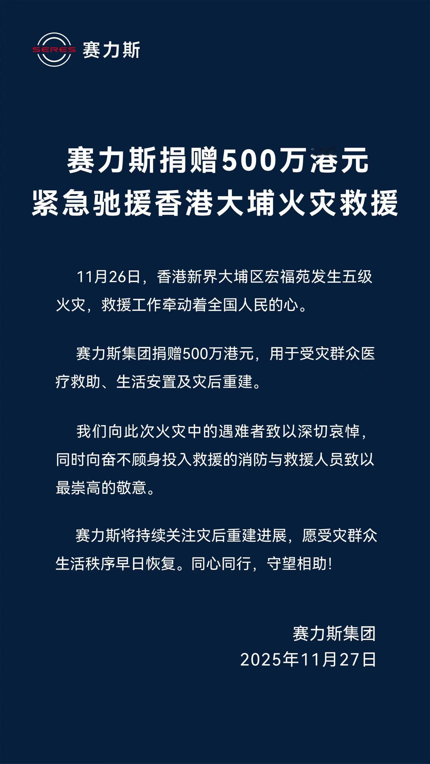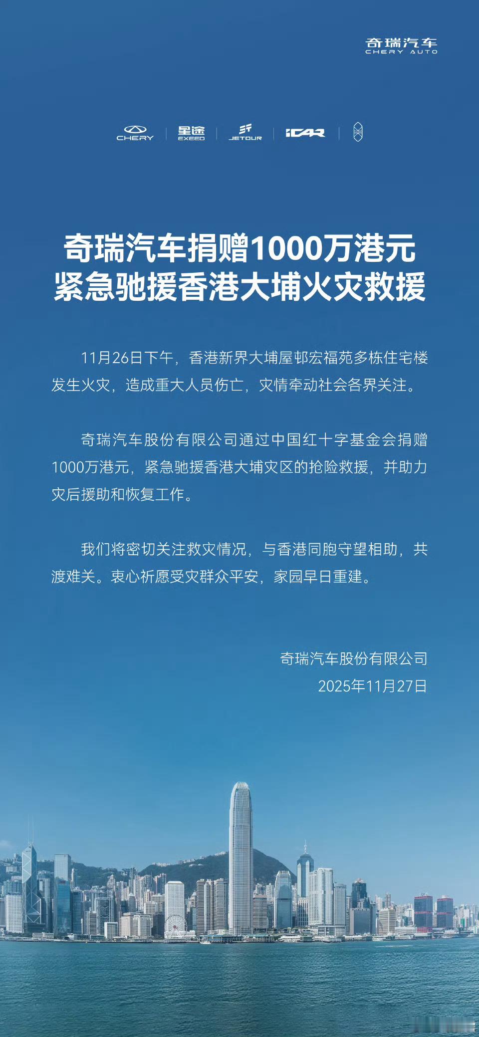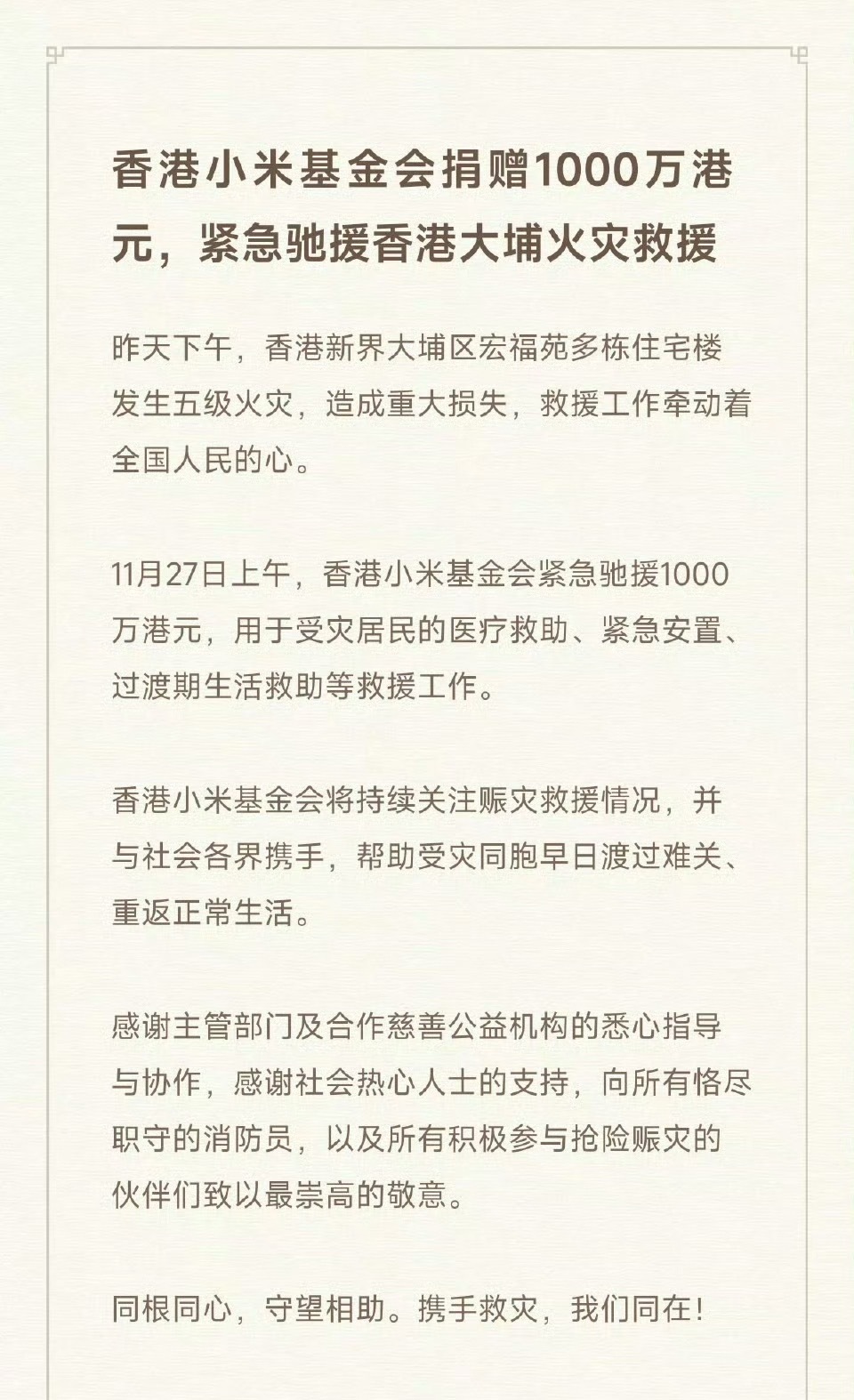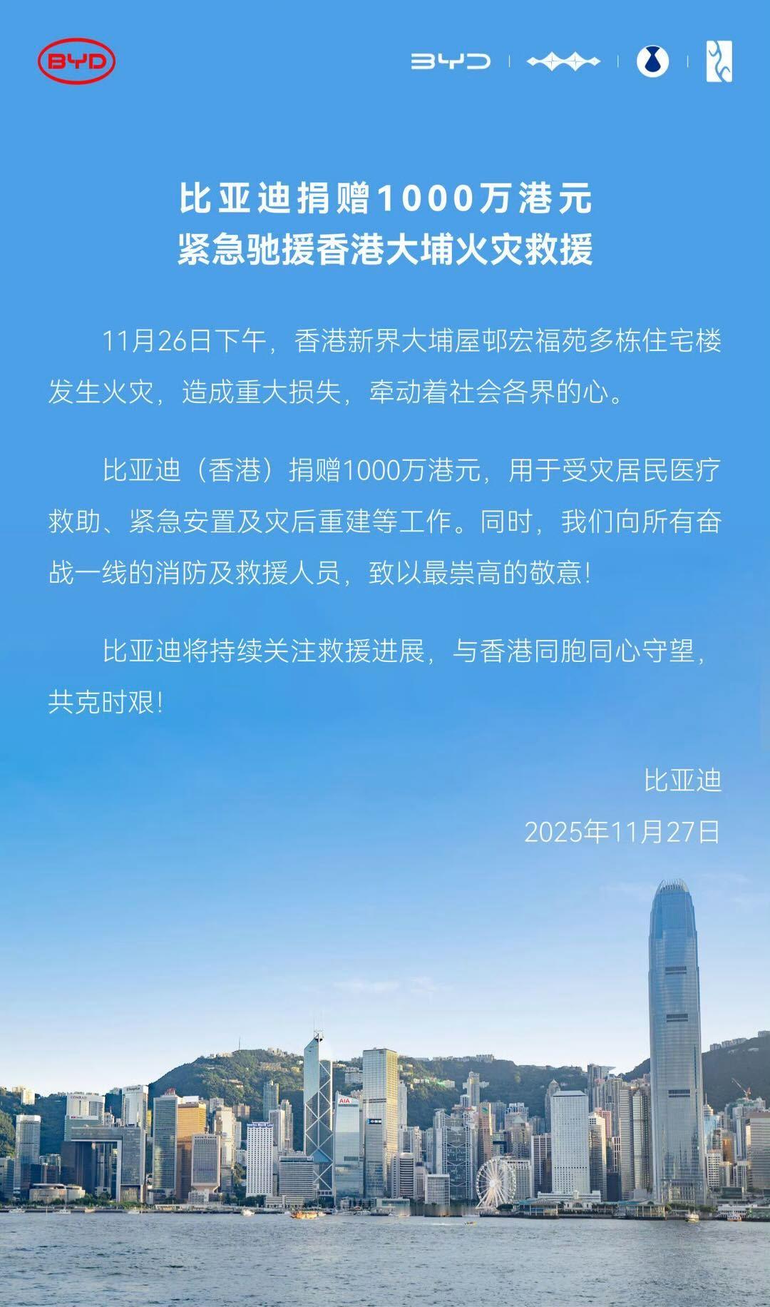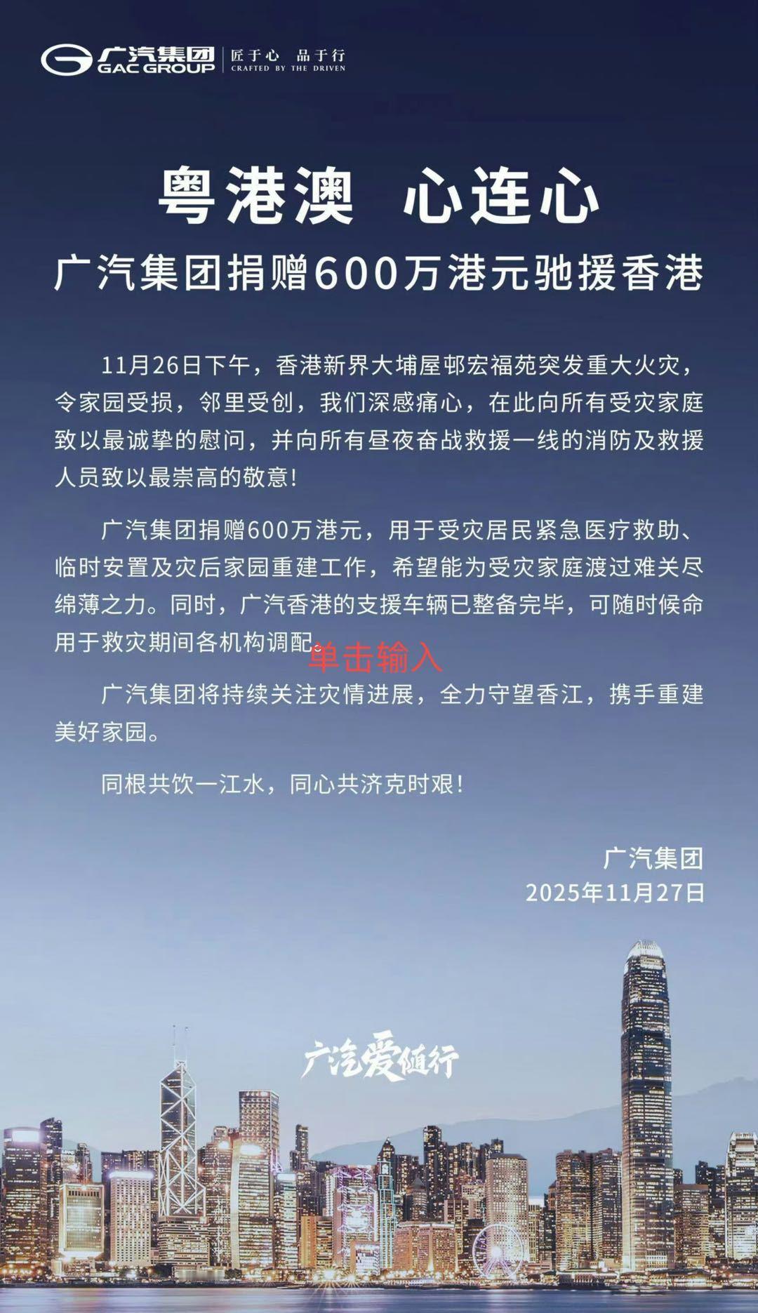 香港向每户灾民发1万港元补助多家车企像向香港大埔火灾捐款一方有难,八方支援聚力才能向上