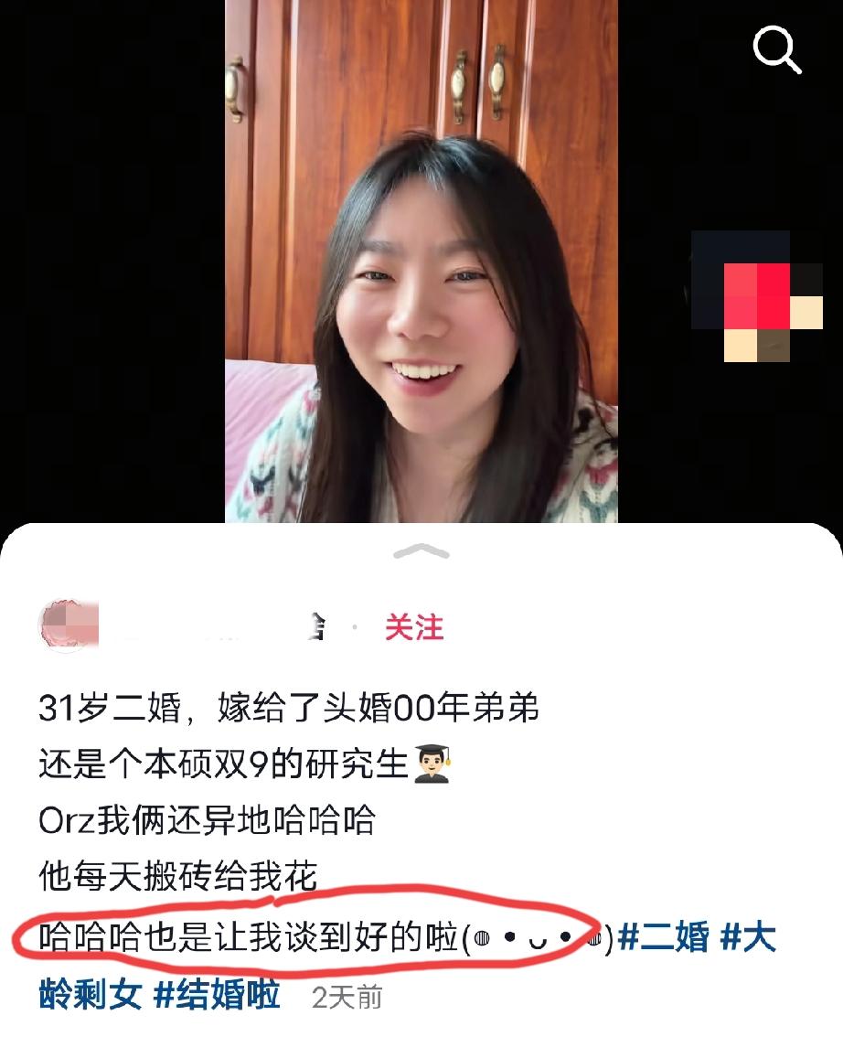 女子发视频炫耀:自己31岁二婚,嫁给了头婚00年弟弟,还是个本硕双9的研究生,俩人目前异地,他每天搬砖给我花…… 女子最后还来上一句:哈哈哈,也是让我谈到好的啦!!! …… 更让人没想到的是,评论区居然不止一位女性网友晒出类似的结婚证和情感经历。也就是说很多经济条件好、家庭条件好的小弟弟都找了比他们大很多岁的、条件比他们差的大姐姐做他们的另一半。 这种现象普遍存在,唯一的解释只能是:30多岁的熟女特别吸引20多岁的年轻小弟弟! 评论区的诸位大神,你们怎么看?