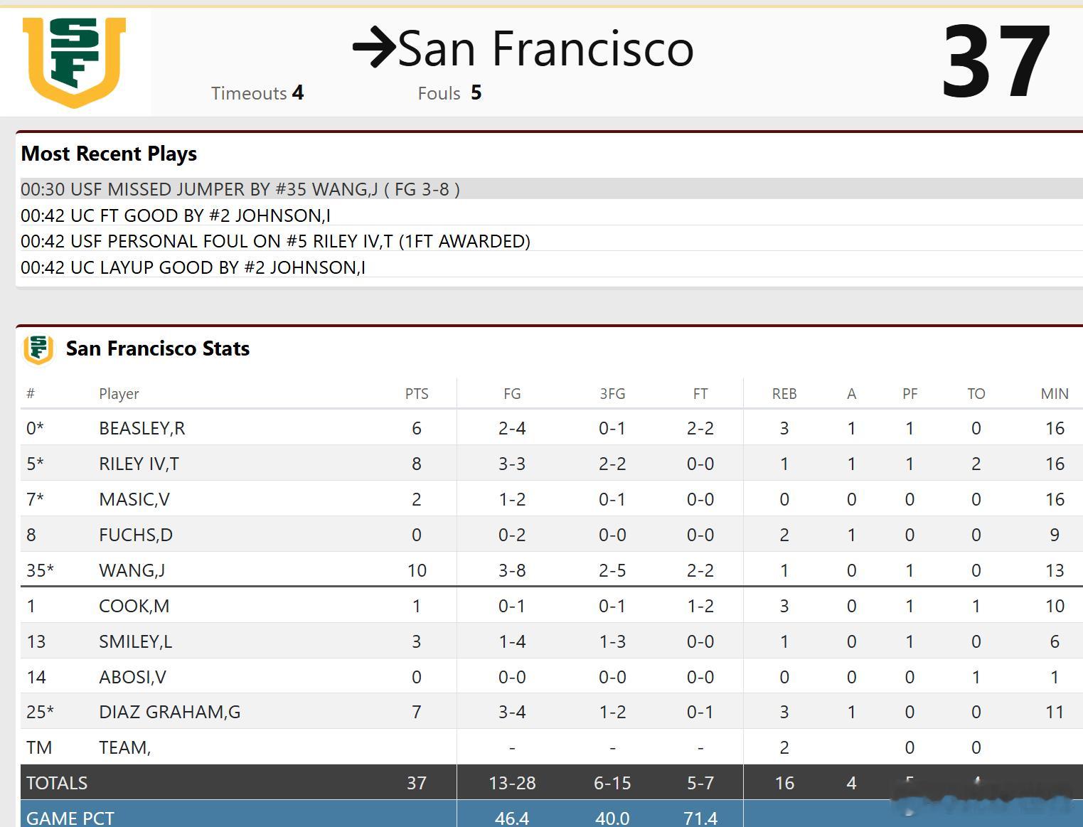 旧金山vs科罗拉多,王俊杰上半场全队最高的10分,三分球2个+罚球2个+一个抢断