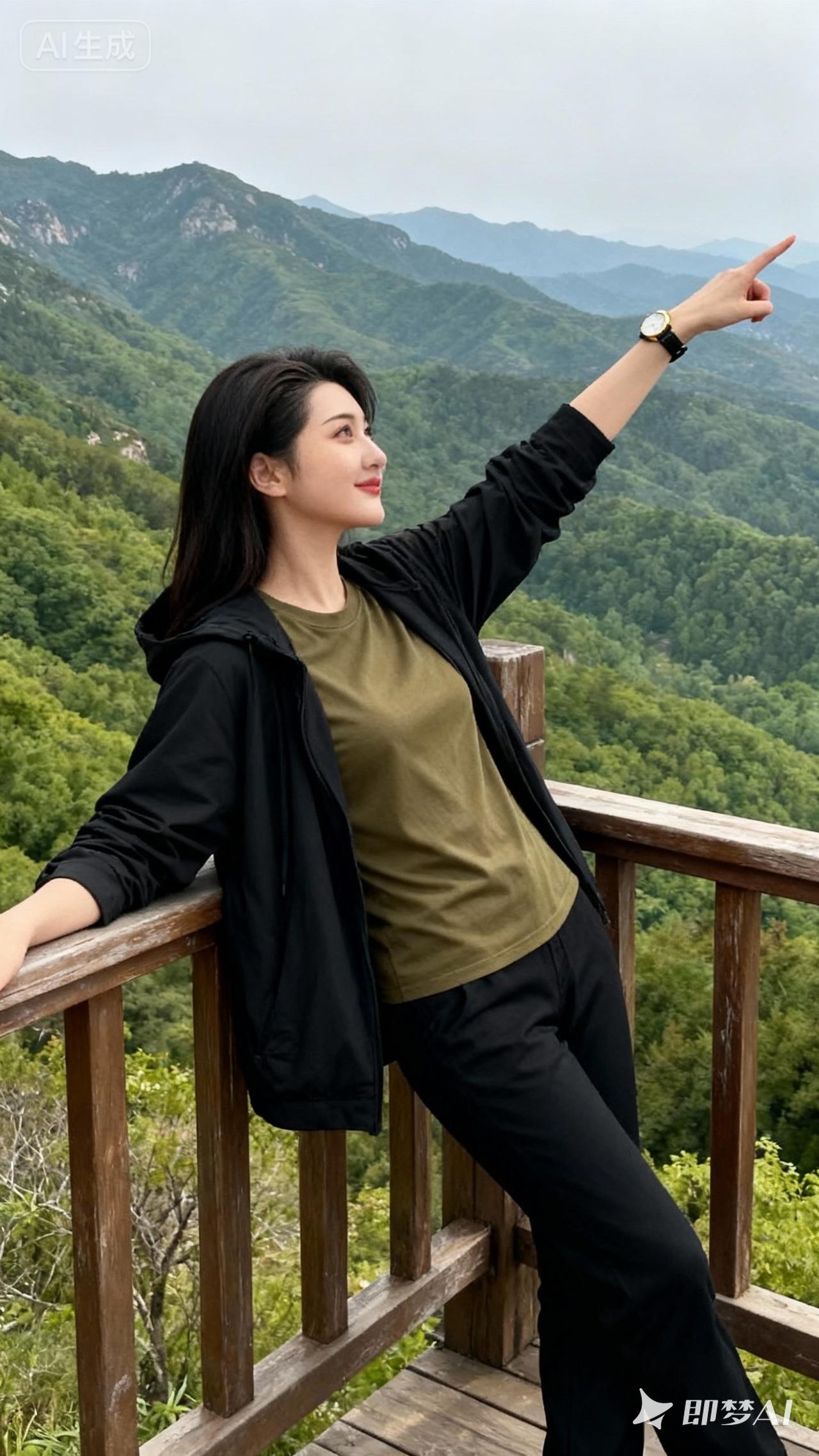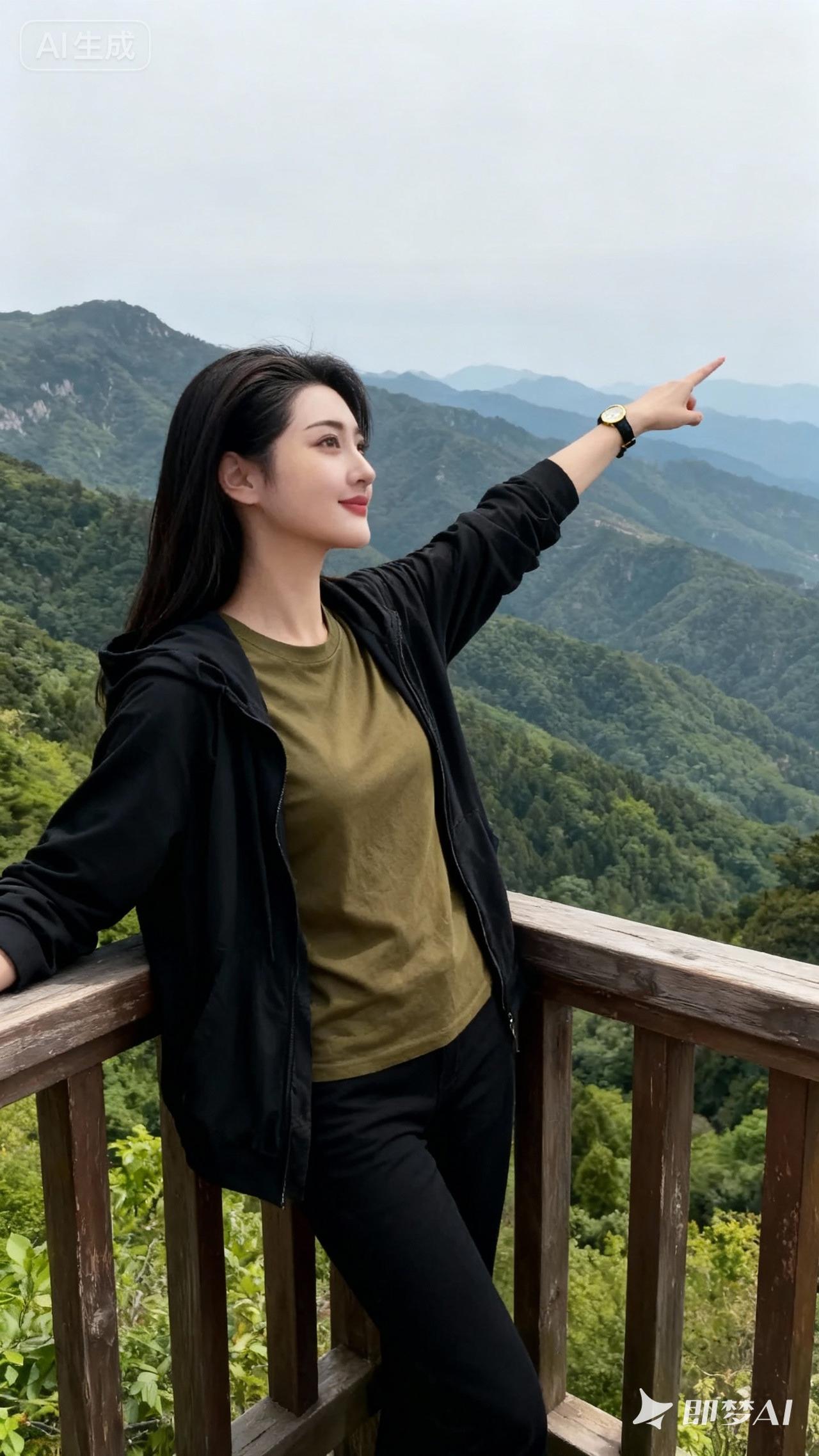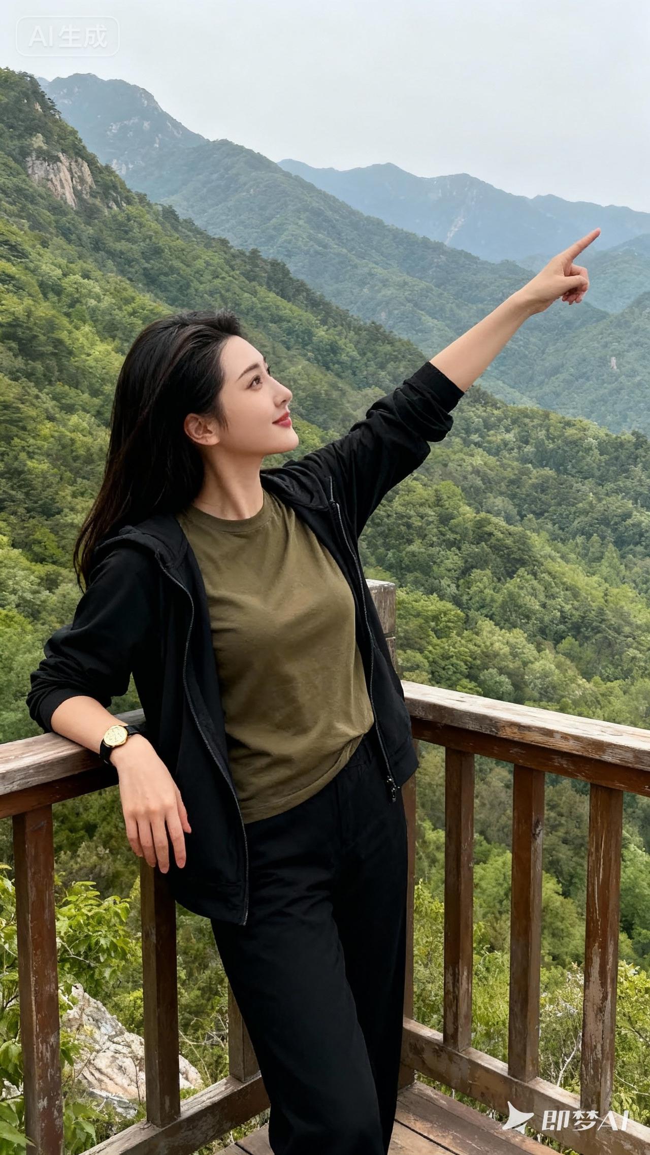 黑衣女子立于山间,静看流水潺潺,自然与时尚完美融合。