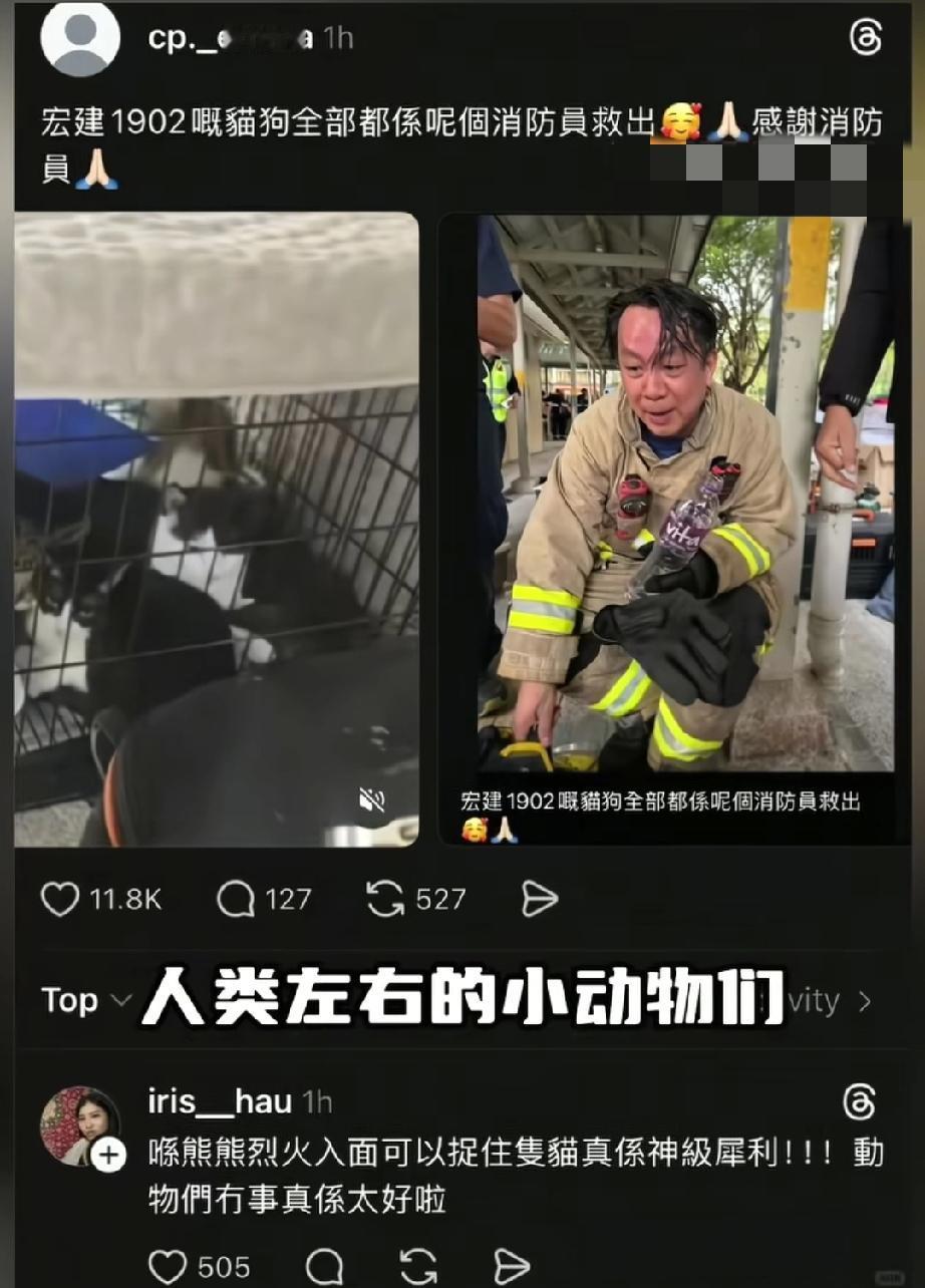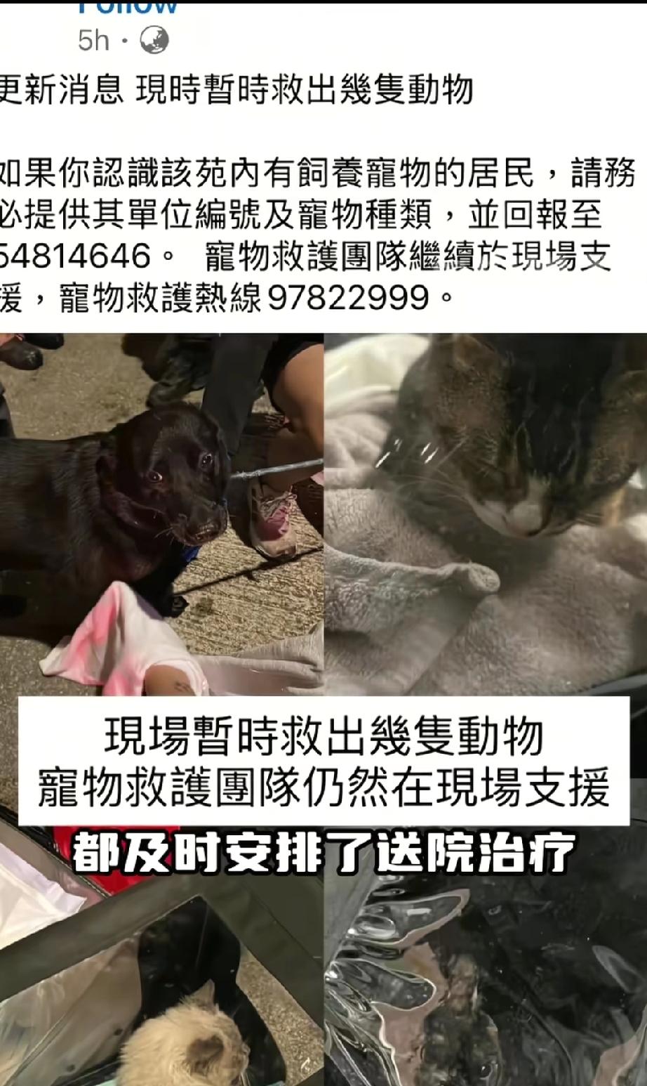 昨夜凌晨。香港动物报HKAP发出15岁老猫获救视频,还有一只鹦鹉,还有乌龟,它们正在接受检查,目前还有上百只动物等待救援。 有网友评论:在动物救治这块香港领先大陆很多。“宠物救援车”我当时在香港看到这个,真的给我看懵了,因为我自己也养狗,我们这边的确没有这个…… 也有网友表示:虽然小动物们是被救出来了,不过有一名消防员也因此丧生了。据说他不多久就将跟相恋十年的女友步入婚姻殿堂了!