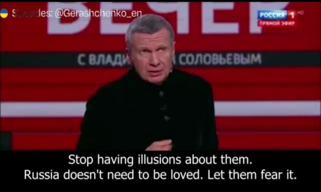俄罗斯国家电视台王牌节目主持人索洛维耶夫在11月27日的节目上说,俄罗斯不需要西方喜爱;西方必须畏惧俄罗斯。 他称,当西方畏惧俄罗斯时,这“表明他们意识到俄罗斯很强大,对它无能为力”,并补充说,西方只有在危机时期才会爱俄罗斯,才会对俄罗斯让步。