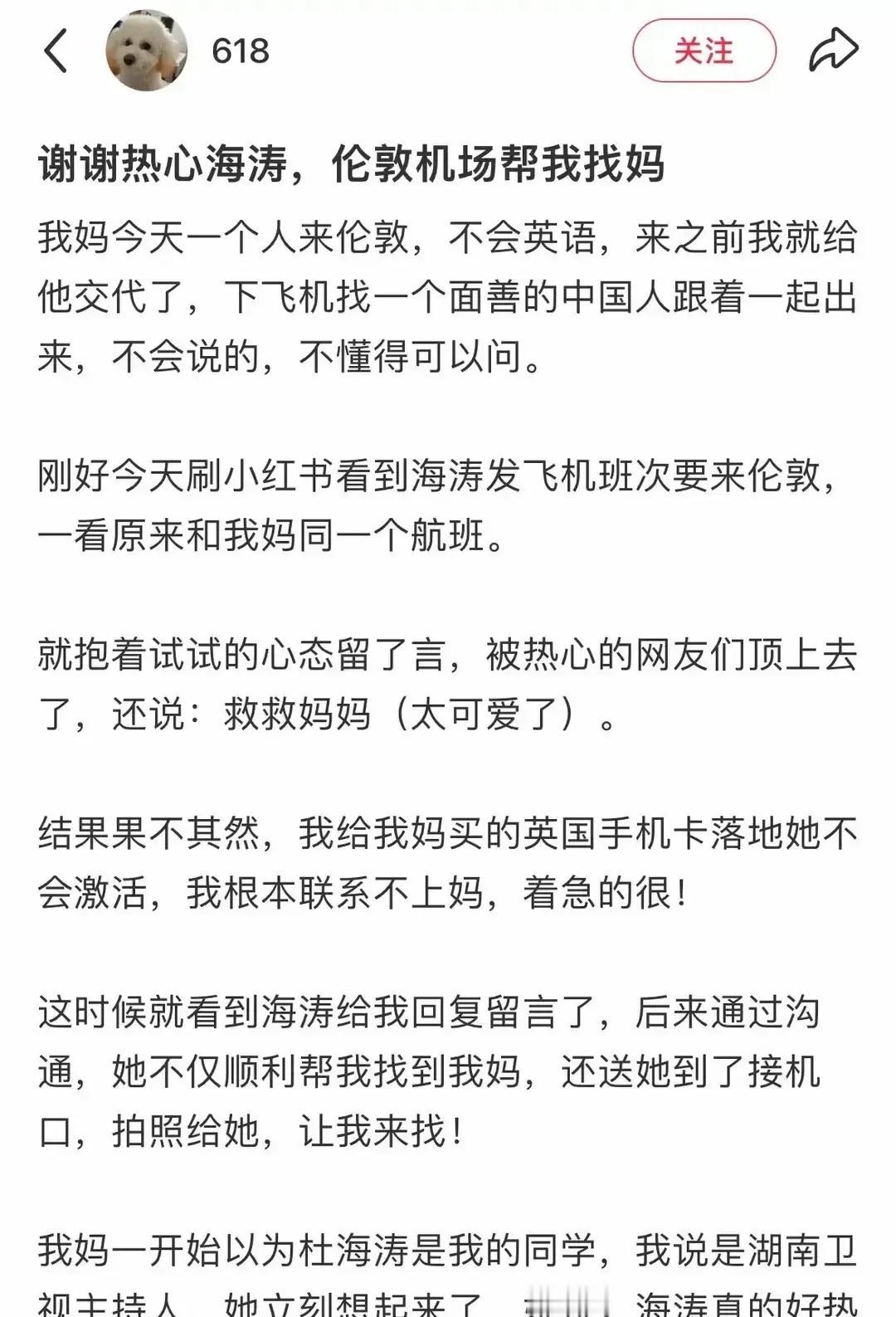 杜海涛在飞机上帮一位不会英语的大妈出关,还一路把行李推到接机口,全程没说自己是谁。 沈梦辰转完网友长文,只留一句“我老公就是善良靠谱”,热搜直接爆了。 两人被嘲了这么多年,难得靠一次低调善举扳回一城。 我看帖子时也被暖到:明星不戴口罩、不摆脸色,蹲在地上帮陌生人装行李,换谁都得点赞。 沈梦辰这回没秀恩爱,只把骄傲写在转发里,反而更动人。 低调做人、高调行善,这对夫妻终于让键盘侠闭麦。 好人不用天天晒,一次伸手就能被看见。 低调久了,真性情反而更闪光。
