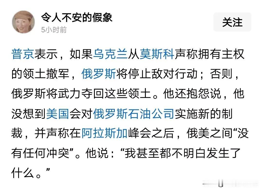 其实,阿拉斯加会晤,川普并没有答应什么,白纸黑字的东西一点都没有,他只不过在杜撰或意念阿拉斯加的会晤是成功的,并以此为念,近乎抓到救命稻草一样不撒手。 至于领土问题,如果执迷不悟,那么一定会撞南墙,当撞得头破血流的时候,就是自己国家分崩离析之时,自个儿也会被钉在历史的耻辱柱上,对他来说,真是悔不当初啊,这大概就是冲动的惩罚吧,该来的总会来。