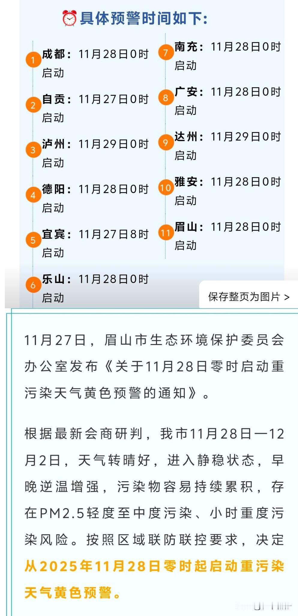 11月28日零时起,眉山市启动重污染天气黄色预警。除眉山外,成都、自贡、泸州、德
