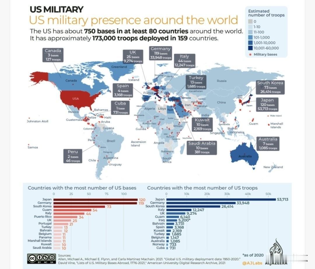 中国拥有遍布世界的港口,用作贸易往来。美国在世界各地设有军事基地,是为了战争。但中国才是威胁?这如何说的通?! 如图3,美国在至少80个国家拥有约750个基地,在159个国家部署了约173000名士兵。 美国就是害怕是世界越来越依赖中国的市场、基建和供应链,害怕它赖以统治世界的话语权和军事压力不再有效。于是,用“威胁论”去恐吓盟友、给中国扣帽子,这是它延续霸权的惯用剧本。 谁在让世界更繁荣、谁在让世界更紧张?答案其实一目了然!