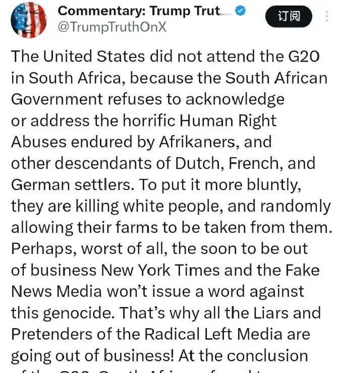 特朗普又要搞事情,北京时间11月27日(今天),美国总统特朗普发文说:“美国没有出席南非G20峰会,根据我的指示,明年白宫也不会邀请南非来参加美国G20峰会。” 我看到这条消息第一反应是震惊,第二反应是去核实。我联系了在约翰内斯堡做矿产贸易的朋友,他说当地讨论最多的不是G20,而是电力、治安和就业。农场冲突确实有,但被简化成种族对立,容易走偏。现实更复杂,历史、土地政策和利益集团纠缠在一起。 特朗普把矛头指向媒体,这很符合他的风格。把舆论战打成主战场,能迅速聚集支持者,但问题是国际议程不会只靠喊话推进。G20是多边平台,主办国有话语权,但要把一个成员彻底排除,涉及程序和共识,不是一个帖子就能定。 如果美国真的停止对南非的资金和合作,影响不只在政治。矿产供应、医药项目、教育交流都会受波及。我的朋友担心最直接的是合同履约风险,美元结算一旦卡住,现金流会立刻紧张。你以为是地缘政治,其实很多企业只是想按时发工资。 这事还有一个悬念:明年美国主办的峰会到底怎么安排?是把南非排除在核心会场之外,还是降级参与,或者干脆设一个“技术工作组”的名义绕过去?多边场合很讲究面子,哪怕不想合作,也会用流程处理情绪。 今年美国缺席,会议照样推进了数字税、能源转型等议题。加拿大领导人在会上说得很直接:没有一个国家,事务也得继续。这个表态不是“反美”,而是提醒大家,多边机制不能被个别人的情绪绑架。越是在全球经济不稳的时候,越要看结果。 我个人不赞成把南非问题简单贴标签。白人农场主遇到的暴力是真实的,南非政府的治理问题也真实,但用极端话术去否定一个国家的资格,只会让对话更难。超级大国如果想带节奏,最好是拿出方案,而不是撒手不管再甩锅媒体。 也别忽视美国国内的盘算。对外强硬可以转移部分注意力,但如果因此错过重塑影响力的机会,代价最后还是由美国企业和消费者承担。通胀没完全消退,供应链还在修复阶段,多制造一个外部变量,不是聪明选择。 接下来我会盯这几件事:白宫是否发布正式函件,南非政府的回应措辞,G20秘书处的态度。三方谁先释放善意,局面就会缓一缓。如果三方都强硬,那就准备迎接一场外交硬仗,市场也会给出反应。 最后提醒大家,别被情绪带着走,真实世界的变化往往在细节里。等下一波消息出来,我们再聊谁在让步,谁在试探底线。