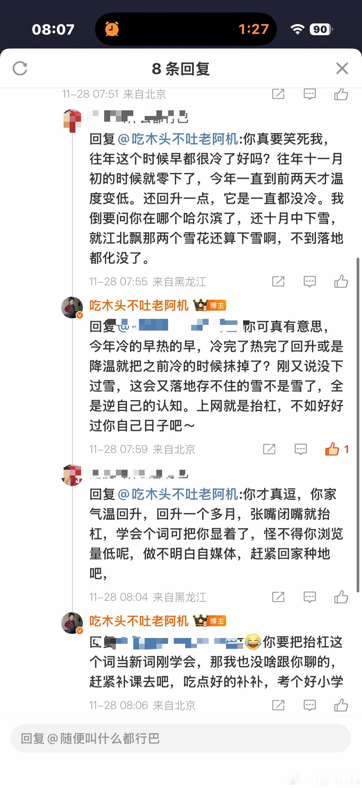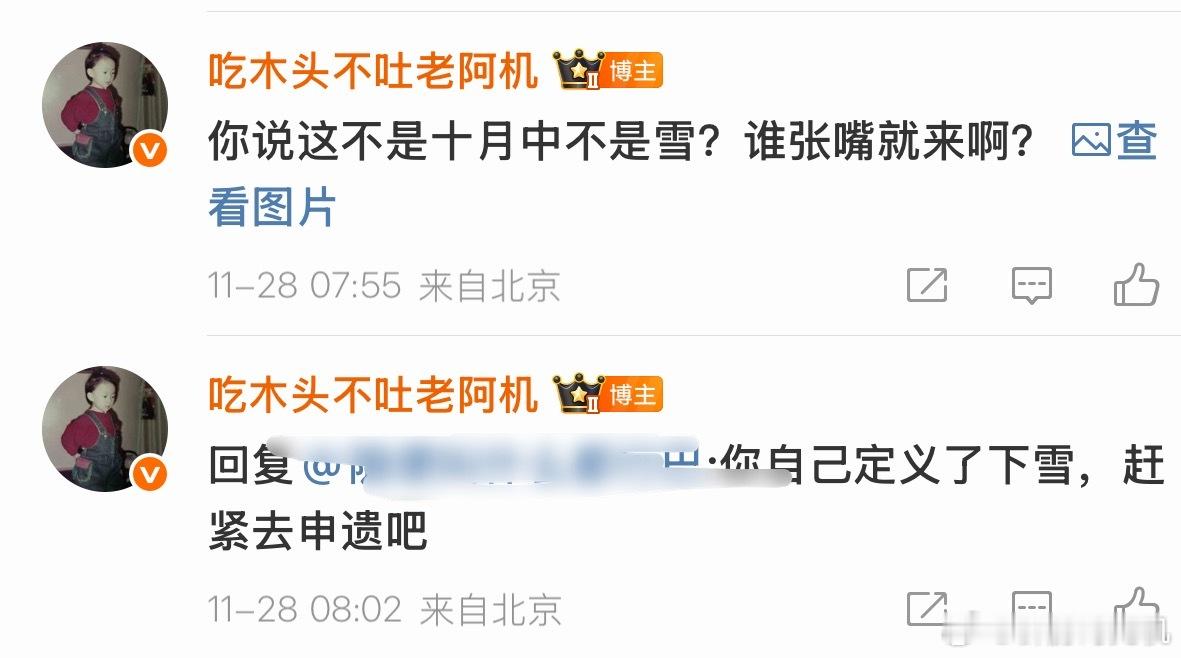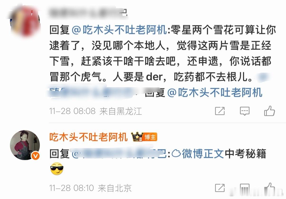 世界真的很无奇不有,我说哈尔滨十月中下雪了都有人杠。说我在哈尔滨我怎么没见哈尔滨下雪,我说我亲眼见的还发了微博,他说你是本地人么,那点雪花都存不住叫下雪?这逻辑我都不知道该回啥,只能给他发了一套中考数学秘籍,祝他考试顺利~