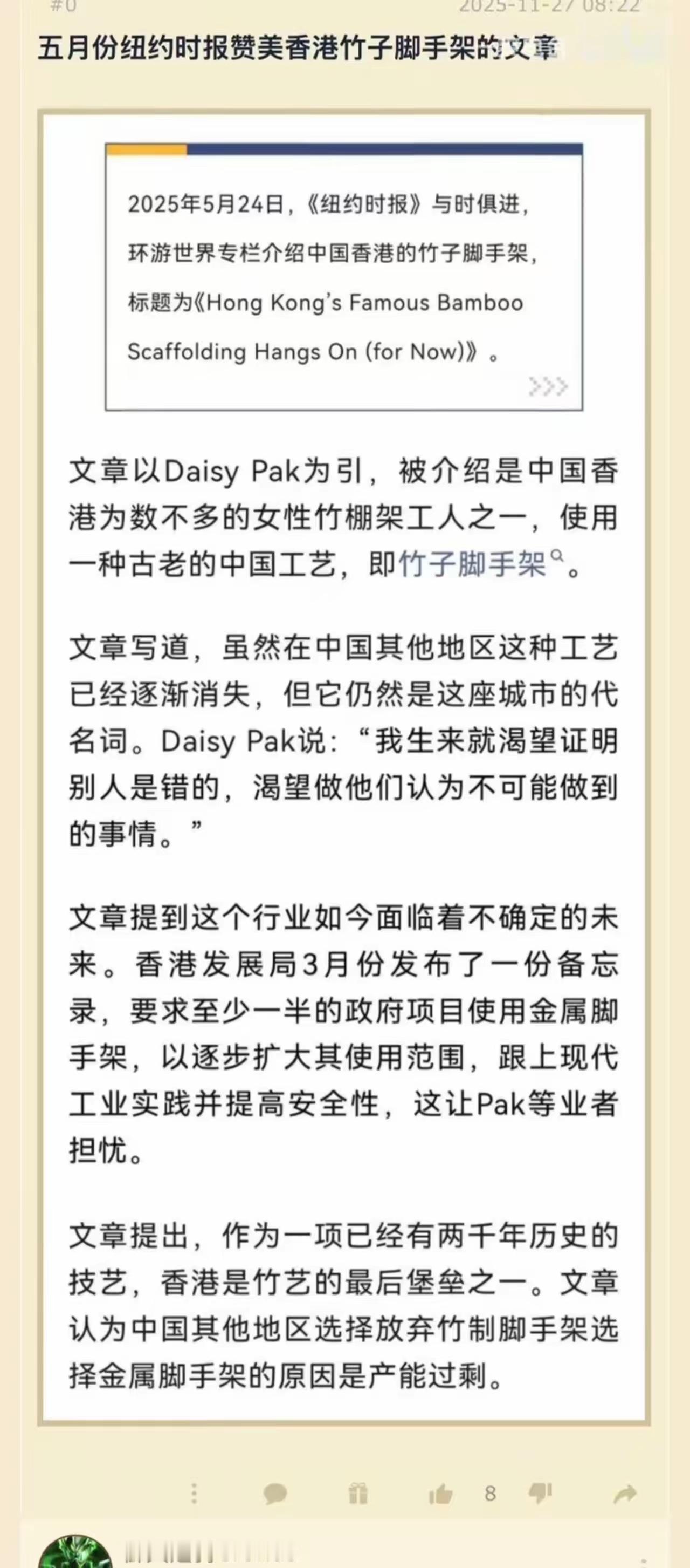 纽约时报今年5月一篇阴阳怪气描述香港竹棚手艺行将灭绝,因为受到内地钢铁产能过剩冲