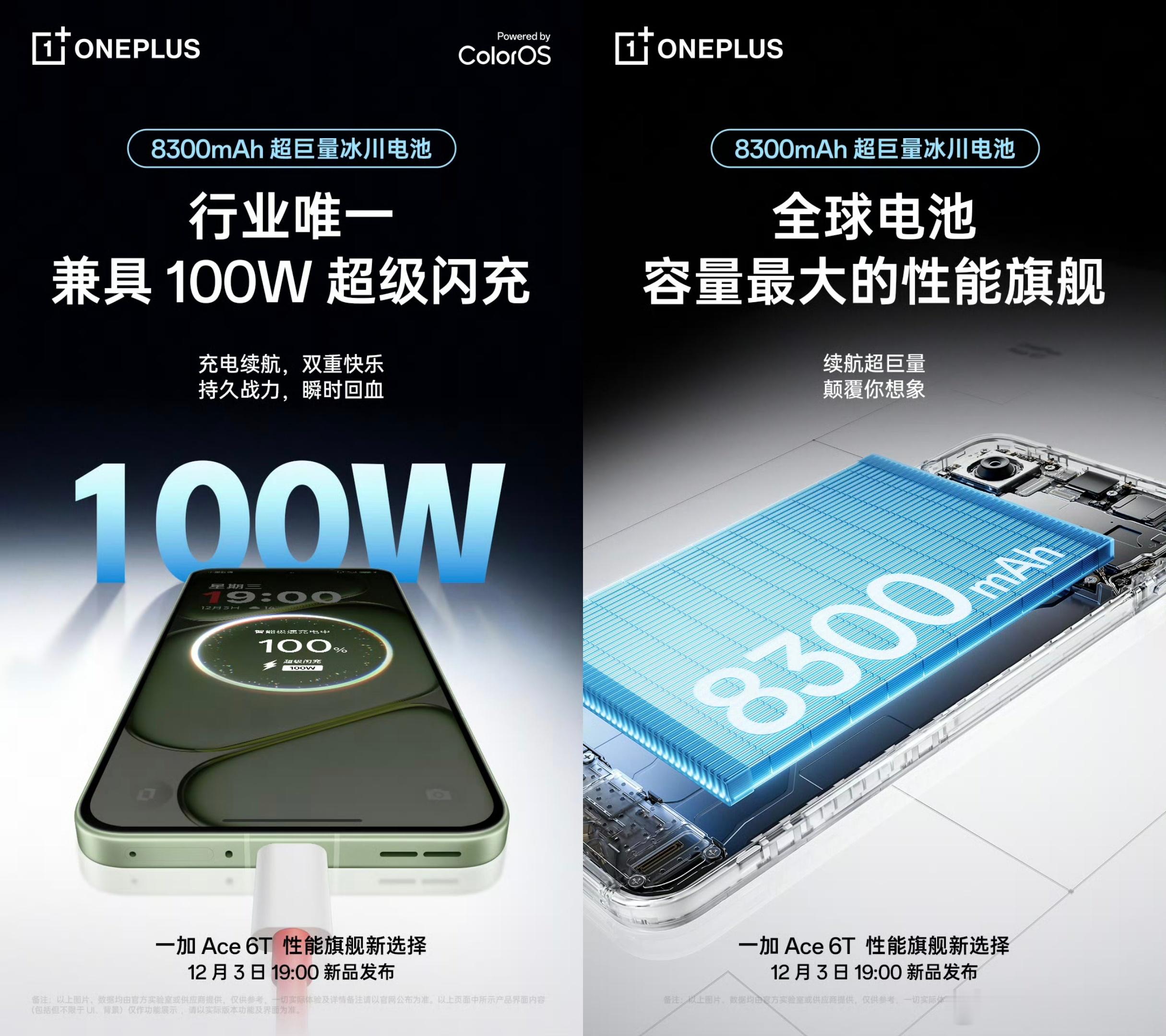 一加Ace6T,100W+8300mAh超大电池。行业首个百瓦快充+8K+大