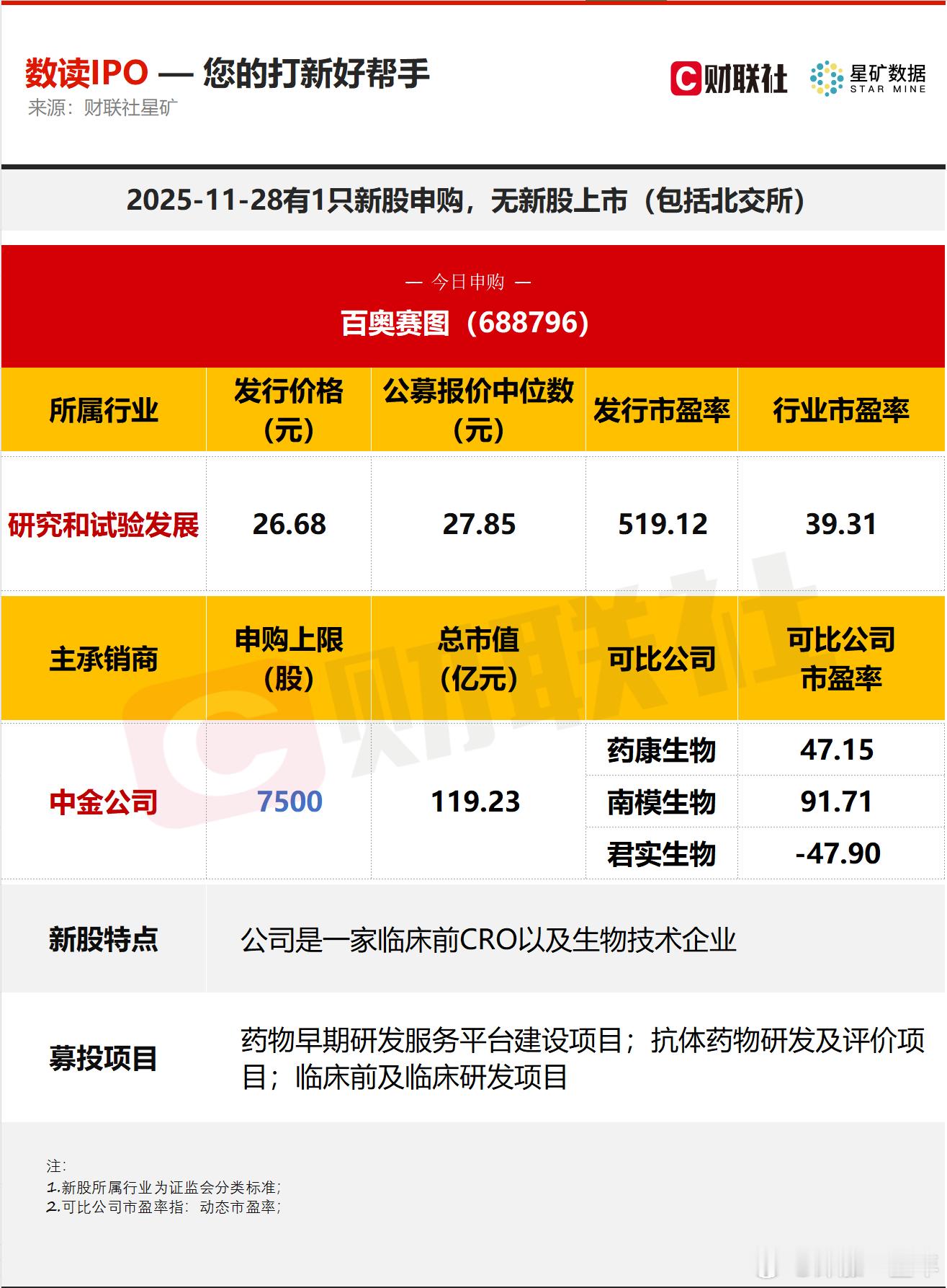 A股 今日有1只新股申购,为科创板的百奥赛图;无新股上市。