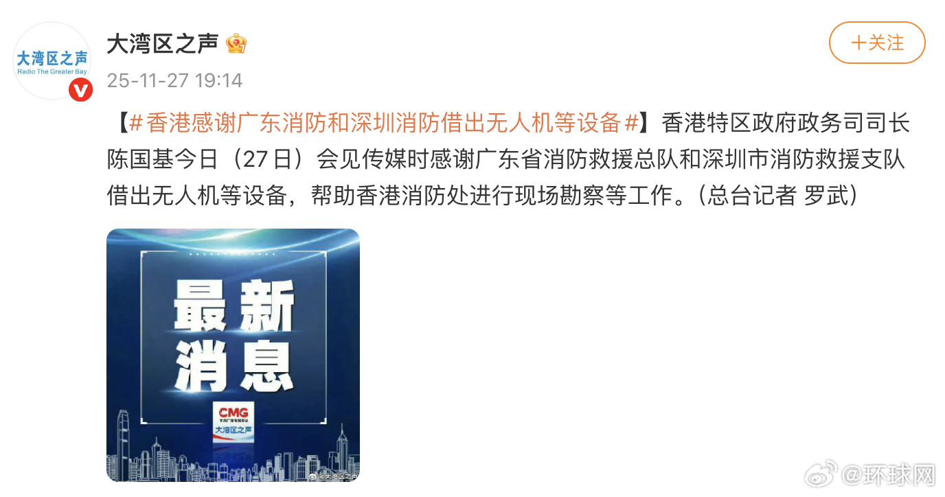#香港感谢广东和深圳消防# 香港特区政府政务司司长陈国基今日(27日)会见传媒时感谢广东省消防救援总队和深圳市消防救援支队借出无人机等设备,帮助香港消防处进行现场勘察等工作。(总台记者 罗武)