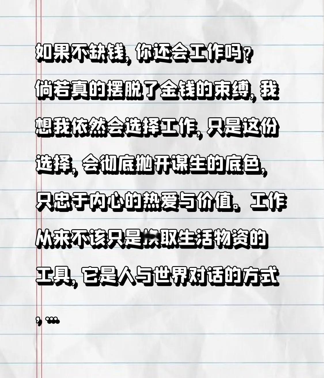 如果不缺钱,你还会工作吗? 倘若真的摆脱了金钱的束缚,我想我依然会选择工作,只是
