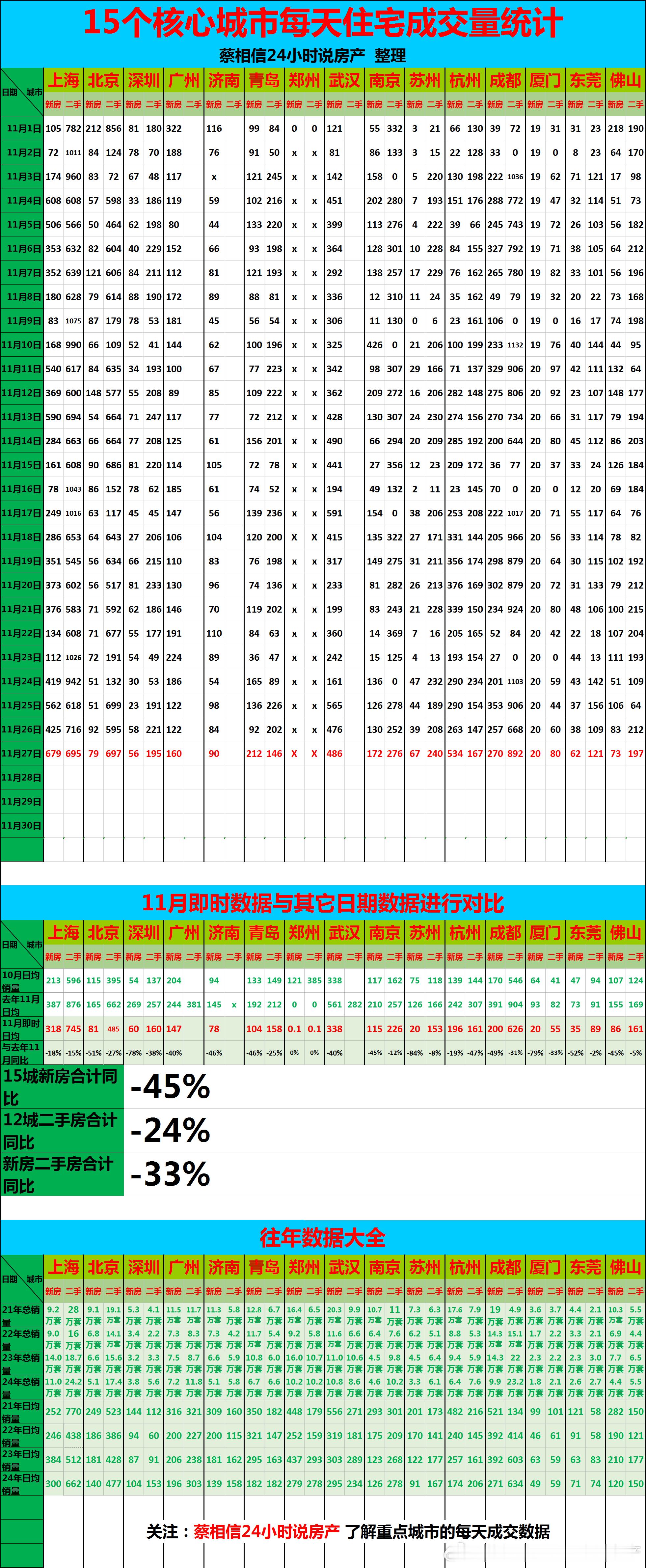11月27日,重点城市住宅销量数据【广告→→→】博主创作不易,几年来,一直在用爱发电,求哥哥姐姐,弟弟妹妹们买点东西吧。质量都非常好,价格也很实惠。都是日常需要的消耗品,所以买了也不算是白花冤枉钱 ,而且还暖心的支持了博主的创作,万分感谢【点击淘宝链接购买宜昌果冻橙→九月红果冻橙 三峡秭归爆汁橙 现摘现发 刚开园的橙子 饱满多汁】今日点评:11月前27日,新房同比下降45%,二手房同比下降24%这个月基本上已成定局,接下来是两天的周末,所以降幅不会缩小。房地产房价