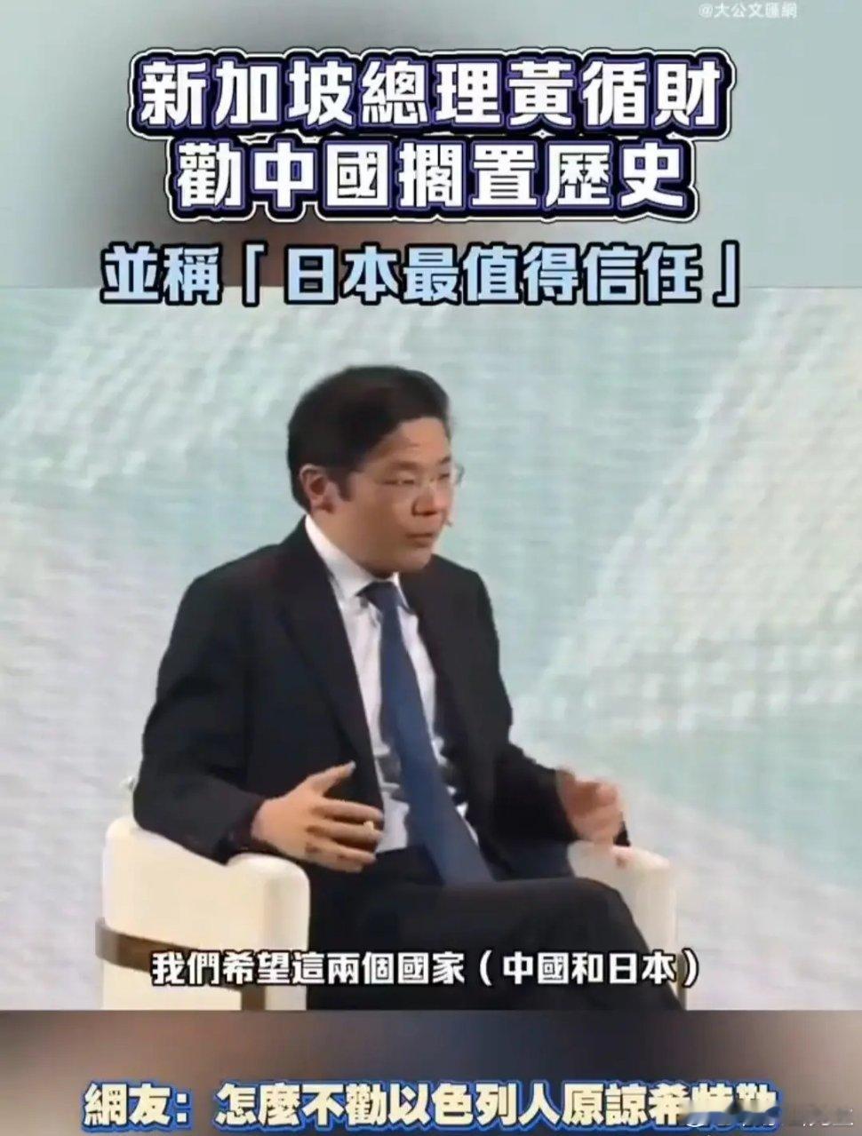 睁眼说瞎话!近日新加坡总理黄循财劝中国搁置历史,还恬不知耻说“日本最值得信任”。有个网友对黄循财评价最到位:你怎么不去劝以色列人原谅希特勒!