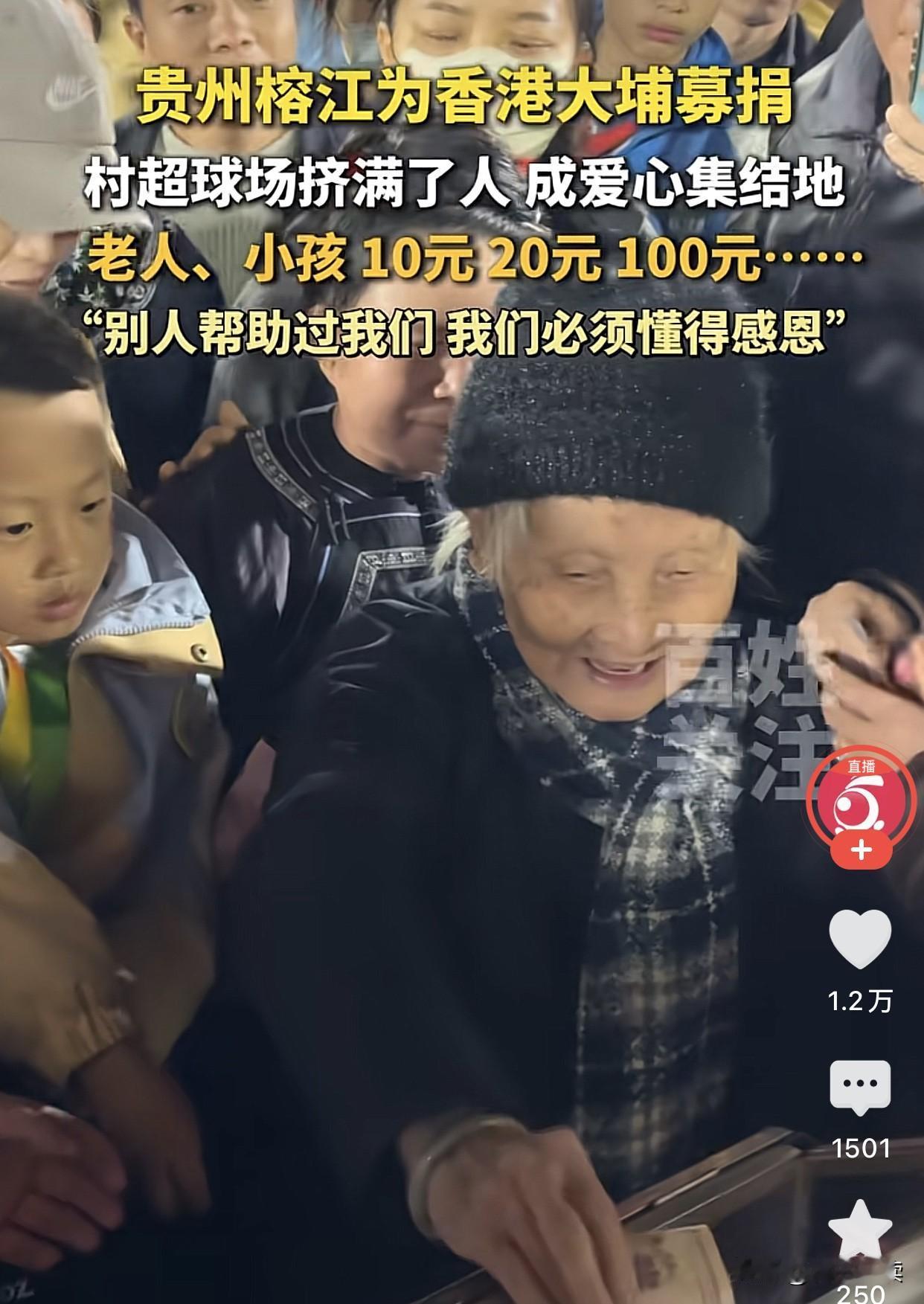 贵州榕江为香港大埔募捐。 村超球场,数千乡亲挤得水泄不通, 只为给香港大埔火灾同胞递去温暖。 今年榕江洪灾, 香港同胞的援手让家园重归完整; 如今香港有难, 大山里的乡亲用行动诠释 “滴水之恩,涌泉相报”。 没有华丽辞藻,只有真心实意, 村超球场的每一笔捐款, 都是同胞同心的见证。 这份藏在烟火气里的善良, 让“一方有难,八方支援”不再是空话, 更让我们看见: 中华儿女的血脉深情, 从来都经得起风雨考验!
