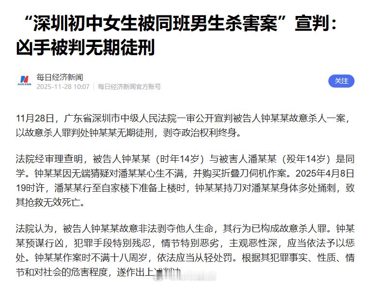 钟某某,未成年杀人案,无期!深圳初三女生遭同学杀害案宣判。尽管钟某某作案手段极其残忍、主观恶性极深、具有明显预谋,法律上限决定了他不能被判处死刑。法院在量刑时已考虑其“犯罪情节特别恶劣、手段特别残忍”,但仍依法从轻处罚,判处无期徒刑——这已是现行法律框架下对未成年人故意杀人罪的顶格刑罚。深圳