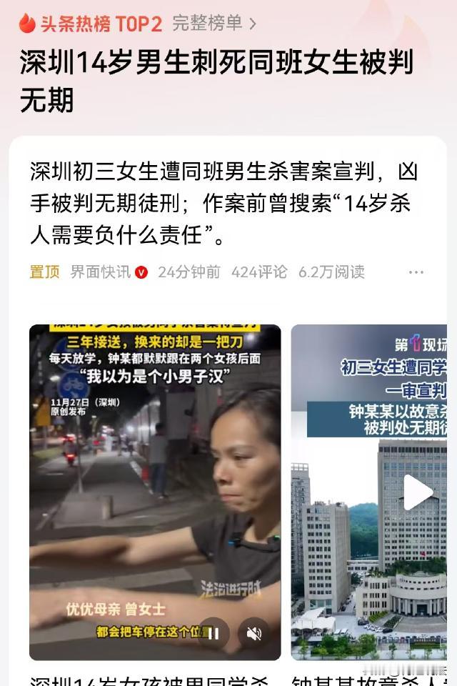 深圳,曾女士无偿接送女儿同班同学钟某两年,结果14岁的钟某竟然在她家门口将女儿杀害,事后,钟某还狡辩称曾女士的女儿霸凌他。今天本案迎来一审宣判,钟某犯故意杀人罪,判处无期徒刑! 据、法治进行时报道,曾女士的女儿是一名14岁的初三学生。 曾女士的女儿有个闺蜜,两家父母也是很好的的朋友,两家住在同一个小区,两家家长约好,每家一天轮流接送孩子。 女儿刚上初中时,同小区有个男生钟某和女儿是同班同学,钟某家里没车,自从女儿上初一开始,曾女士接送女儿时,都会好心将钟某带上。 就这样,曾女士接送钟某,一接就是将近3年。 2025年4月8日傍晚放学后,女儿和闺蜜、以及钟某是由朋友接回来的,朋友将他们送回小区又开车离开了。 当天傍晚,曾女士正在家里做饭,突然听到楼下有人喊,说有个女孩晕倒了。 曾女士心里咯噔一下,因为她的女儿有低血糖,她担心楼下那个孩子是自己的女儿。 曾女士下楼后看到倒地的确实是她的女儿,但女儿并不是晕倒,她满身是血,气若游丝,全身上下都是刀伤,分明是被人杀害了。 后经调查,曾女士搞明白了怎么回事。原来,做下这一切的就是她好心接送了3年的那个孩子钟某。 因自己家条件好,且女儿学习也比他好,钟某竟然心生嫉妒,当天,因为一点小事,钟某就怀疑曾女士的女儿看不起他,捅了曾女士的女儿多刀。 期间,钟某原本已经转身离开,听到曾女士的女儿躺在地上呼救,钟某又返回再次捅刺了她多刀。 后经调查,钟某案发前网购了一把折叠刀,并且多次搜索未成年人 人会受到什么处罚,也就是说,这一切,都是他蓄谋已久的。 更让曾女士不能接受的是,案发后,钟某竟然说,他是被曾女士的女儿霸凌,才不得不反击的,可经同学们证实,钟某所说根本不属实,事实上,钟某经常欺负他人。 一、钟某的行为应该如何认定? 显然,钟某构成故意杀 人罪。 《刑法》第二百三十二条规定,故意杀 人罪是指故意非法剥夺他人生命的行为。 钟某因嫉妒以及怀疑曾女士的女儿看不起他,便产生了杀 害对方的念头。 他案发前网购了一把折叠刀,还多次搜索未成年杀人会受到什么处罚,这些行为充分表明他对自己的行为后果有明确的认知,是有计划、有预谋地实施犯罪,并非一时冲动或过失导致。 案发当天,钟某因一点小事对曾女士的女儿进行捅刺,在原本已经转身离开后,听到对方呼救又返回再次捅刺多刀,钟某的行为直接导致被害人死 亡。 二、钟某是作为未成年人,他是否会因此减轻处罚? 《刑法》第十七条规定,已满十六周岁的人犯罪,应当负刑事责任。已满十四周岁不满十六周岁的人,犯故意杀 人、故意伤害致人重伤或者死亡、强奸、抢劫、贩卖毒品、放火、爆炸、投放危险物质罪的,应当负刑事责任。 钟某案发时14岁,属于已满十四周岁不满十六周岁的人,且其实施了故意杀 人的犯罪行为,因此应当负刑事责任。 《刑法》第十七条同时规定,对依照前三款规定追究刑事责任的不满十八周岁的人,应当从轻或者减轻处罚。 钟某的行为构成故意杀 人罪,且手段残忍、情节恶劣,造成了严重的后果,必须给予刑事处罚。 但是,考虑到钟某是未成年人,具有一定的可塑性,应当从轻或者减轻处罚,因此,钟某不会被判处死刑。 除了刑事责任外,根据《民法典》第一千一百八十八条规定,无民事行为能力人、限制民事行为能力人造成他人损害的,由监护人承担侵权责任。 钟某作为未成年人,其造成他人损害的侵权责任应由其监护人承担。曾女士有权要求钟某的监护人承担相应的民事赔偿责任,以弥补其因女儿死 亡所遭受的经济损失和精神痛苦。 据曾女士称,案发后,钟某一家从未主动道歉,钟某甚至还抱怨事情一直未结束,扰乱了他的生活和学习。 一审开庭时,钟某钟某得知自己可能判死刑才害怕起来,跪在地上向曾女士道歉,说以后他给曾女士当儿子,给她养老。 11月28日,本案一审宣判,钟某犯故意杀 人罪,判处其无期徒刑,剥夺政治权利终身。