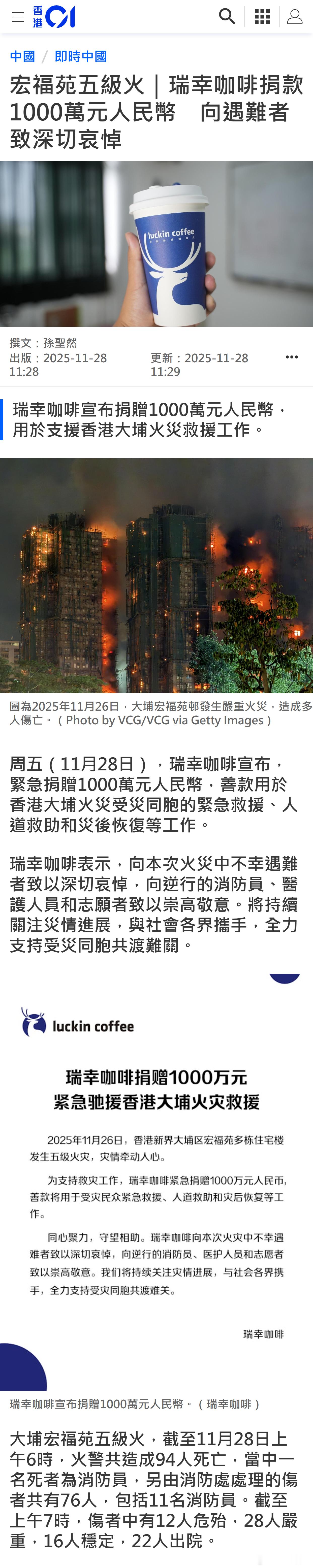 宏福苑五级火|瑞幸咖啡捐款1000万元人民币 向遇难者致深切哀悼