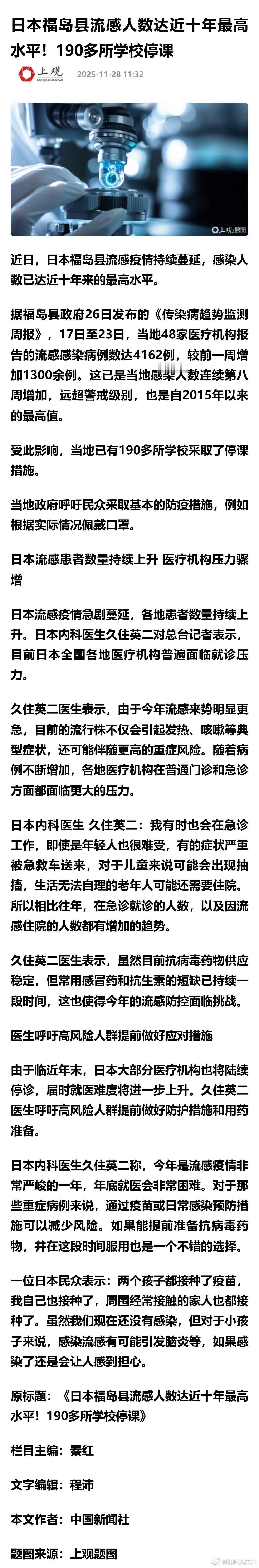 日本福岛县流感人数达近十年最高水平!190多所学校停课