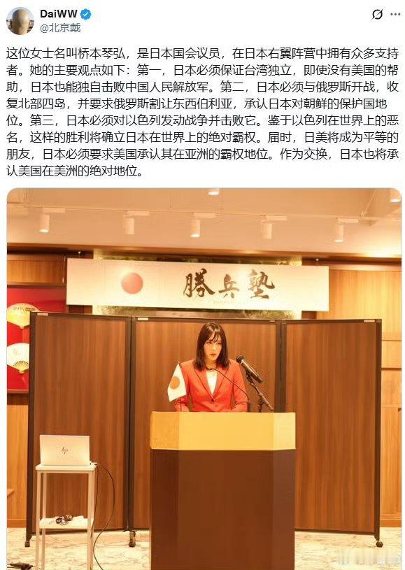 在日本当国会议员的门槛这么低吗?这位日本国会议员叫桥本琴弘,在日本右翼阵营中拥有众多支持者。她的观点:第一,日本必须保证台湾独立,并击败中国人民解放军。第二,日本与俄罗斯开战,收复北部四岛。第三,日本以色列发动战争并击败它。高市早苗再发谬论给自己壮胆热点观点
