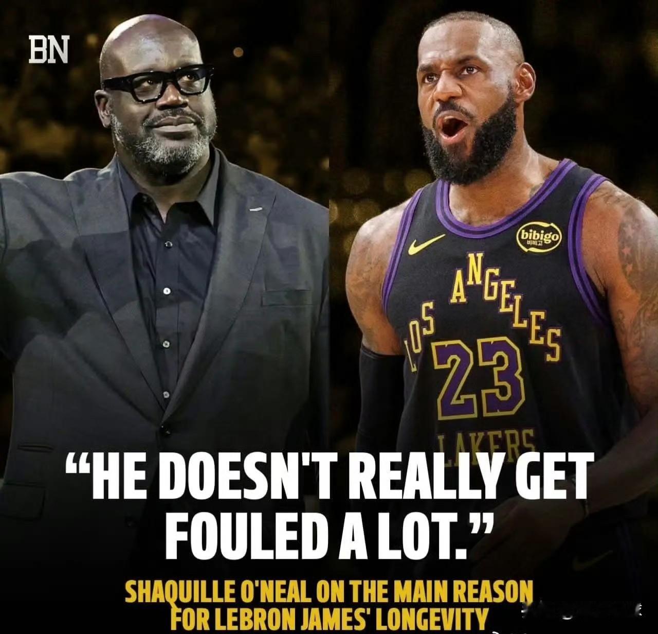 奥尼尔关于詹姆斯的职业生涯能维持这么长久的原因:“他确实没什么遭受到恶意犯规。”