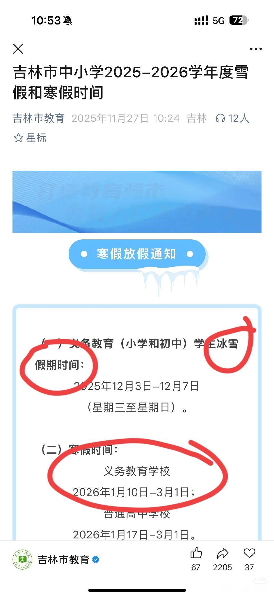看了吉林省的暑假和寒假时间, 作为江苏的家长, 真的好羡慕呀,北方还有冰雪假,浙江有春秋假,东南沿海的还有台风假,啥啥沾不上! 1月10号就放寒假了,那江苏要到2月7号,迟迟迟了一个月! 好想全国统一一下,南方寒假那么短,暑假也没长几天,这方面东北学生幸福很多! 广东网友说,突然有点难过,你要说东北寒假长是因为冷,那暑假比广东还长是什么意思呢,广东每次放暑假都恨不得到7月中旬才放。 。。 广东老师直接表示我也要去东北当老师,我们1.30才放寒假晕了! 东北寒假 吉林寒假 吉林市寒假 辽宁寒假 东北过暑假 北方寒假