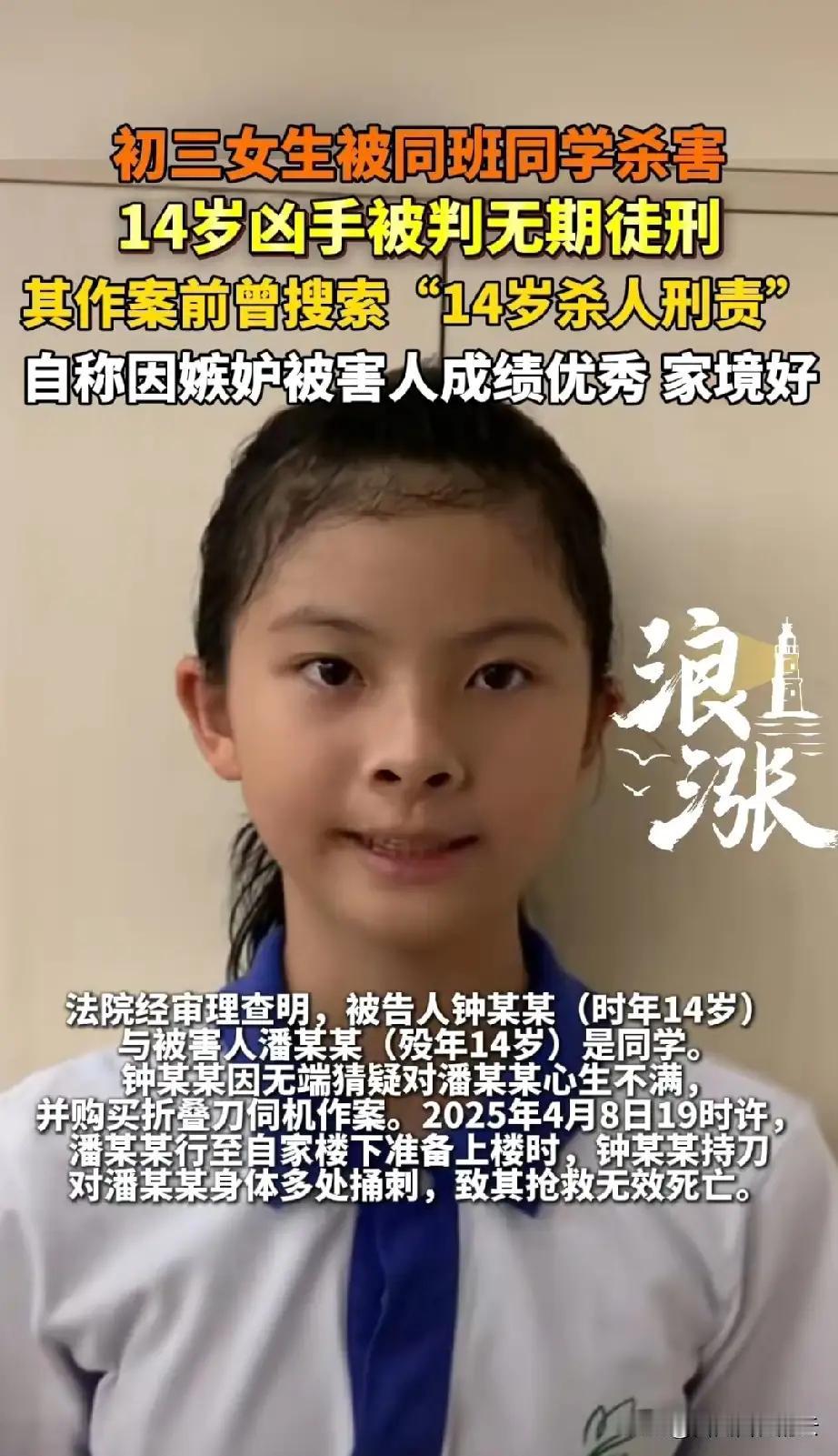 天呐!深圳一14岁男生竟残忍杀害同龄女同学,还被判无期,这消息简直炸裂! 这男生仅仅因为无端猜疑,就网购折叠刀。4月8日晚,女生刚走到楼下,他如恶魔般窜出,疯狂捅刺,女生鲜血直流,最终不幸离世,手段令人发指。 庭审时,凶手和律师竟厚颜无耻地称是“校园欺凌”所致。可老师和同学作证,一直是他在欺负别人。更讽刺的是,他行凶前还搜过“14岁杀人责任”,预谋明显。 这起悲剧如重锤,敲响未成年人教育保护的警钟。家庭、学校、社会都得行动起来! 如此惨痛,怎能不重视?大家觉得怎样加强未成年人教育?